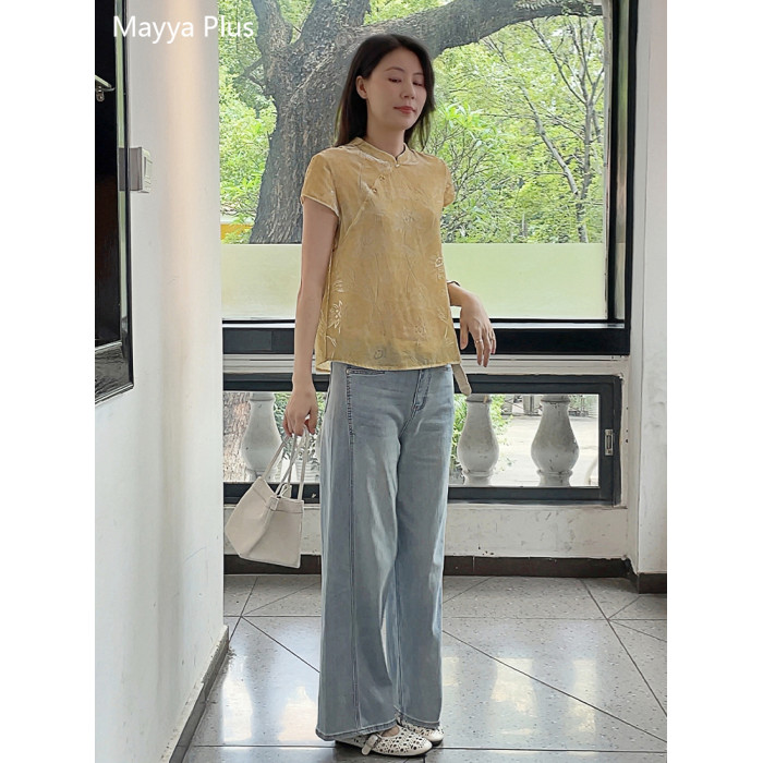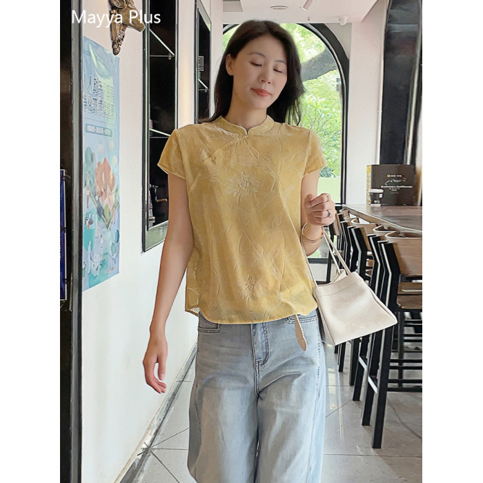 麥芽Mayya Plus 國風立領絲絨燒花短袖襯衫女夏復古盤釦黃色上衣