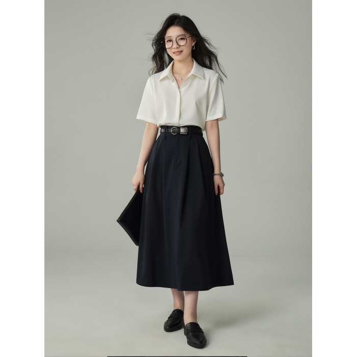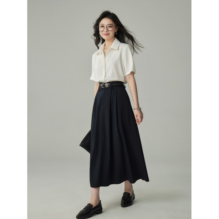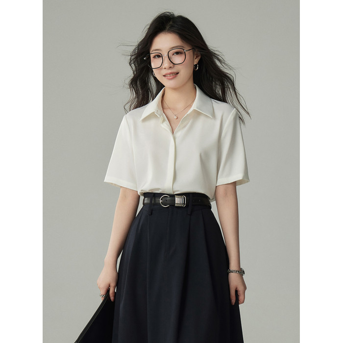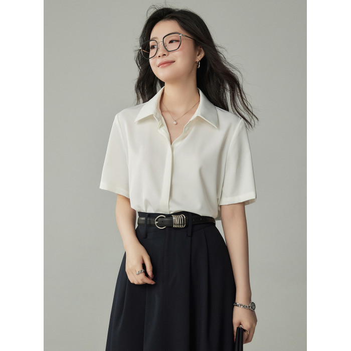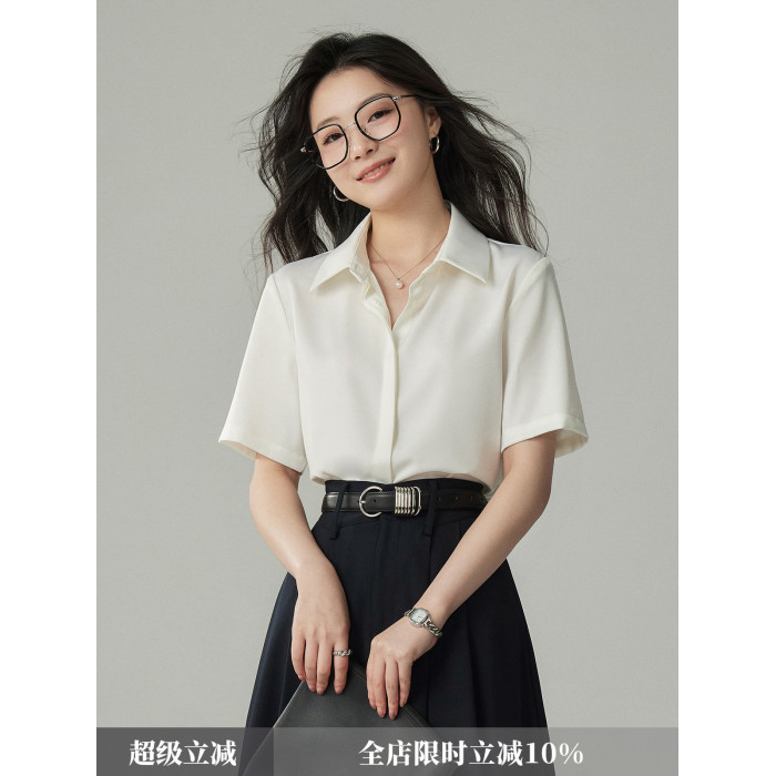 婭可家白色暗門襟緞面短袖襯衫女夏季垂感不易皺通勤職業面試襯衣
