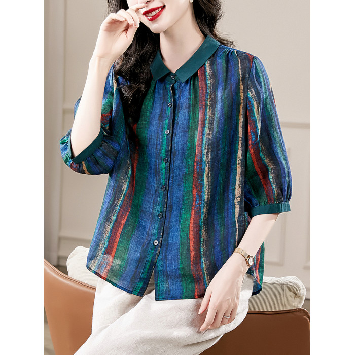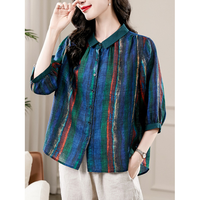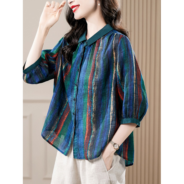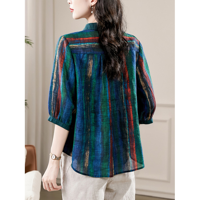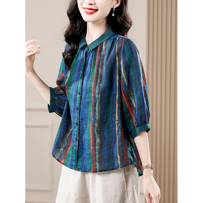 韓穆品牌時尚苧麻上衣女2025年夏季新款中年媽媽大碼寬松條紋襯衫