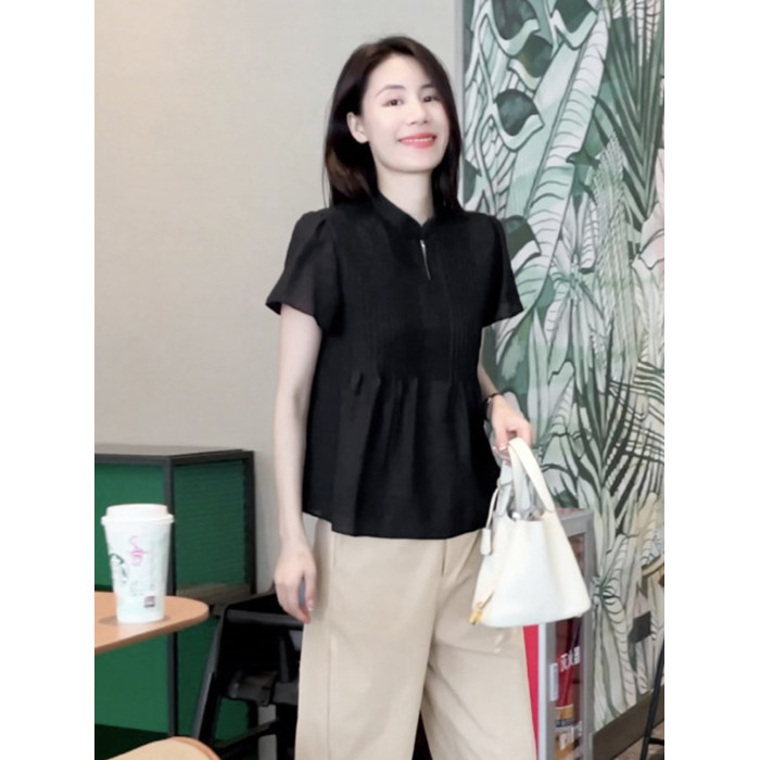 Mayya Plus短袖襯衫女夏季新款百褶盤釦黑色設計感休閒小衫上衣