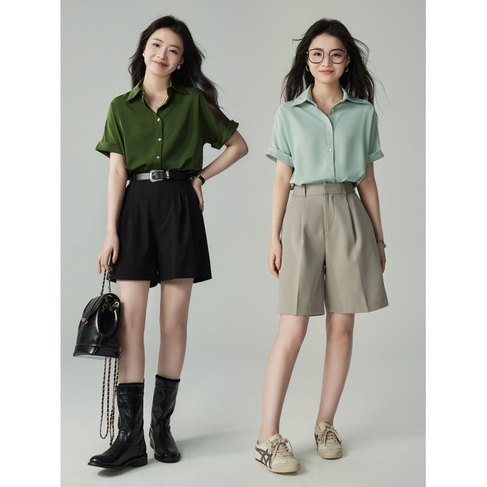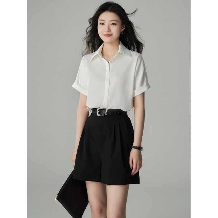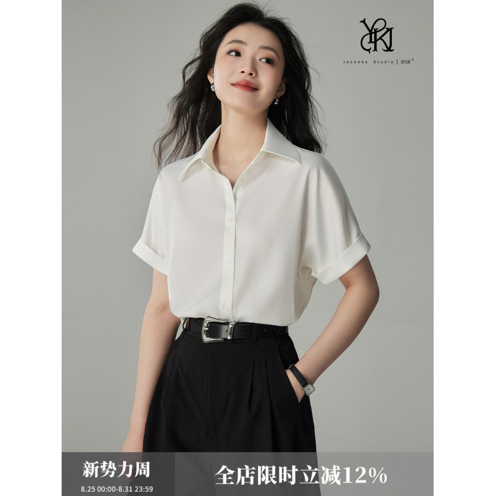 婭可家白色緞面短袖襯衫女夏季OL職業正裝通勤垂感不易皺面試襯衣