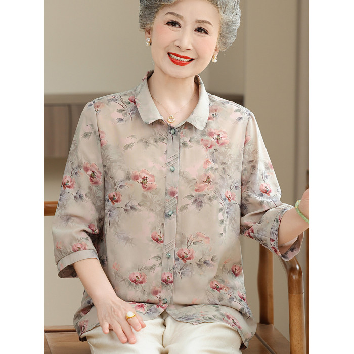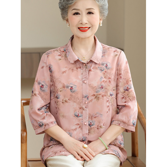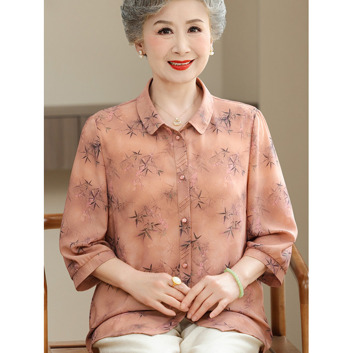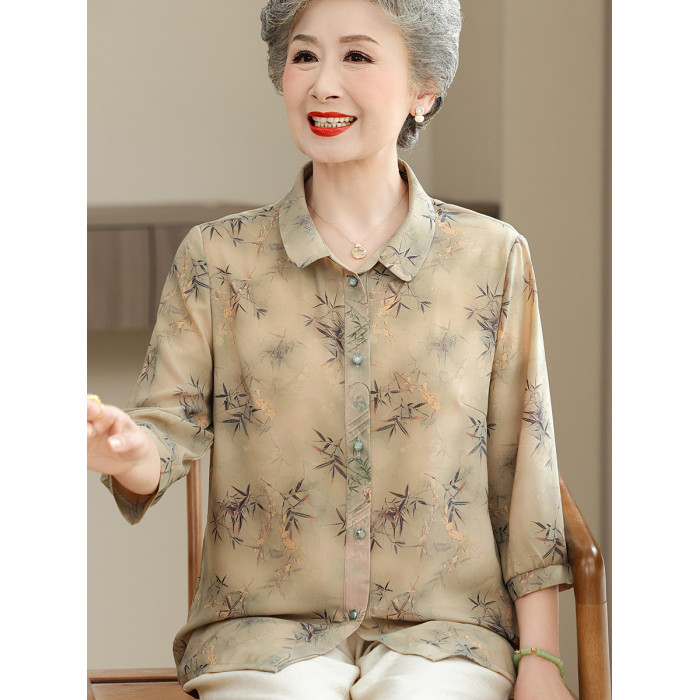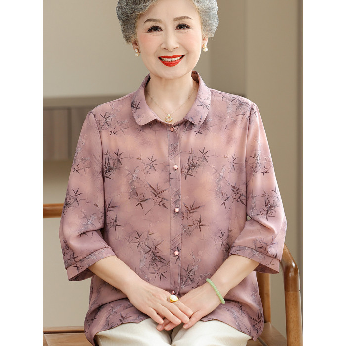 中老年女裝老太太夏裝新款上衣寬松雪紡開衫奶奶翻領七分袖薄襯衫