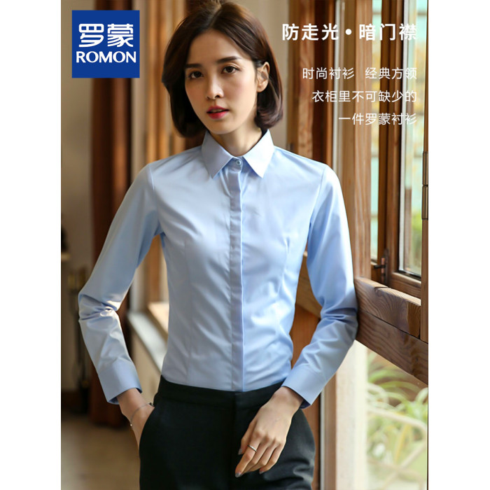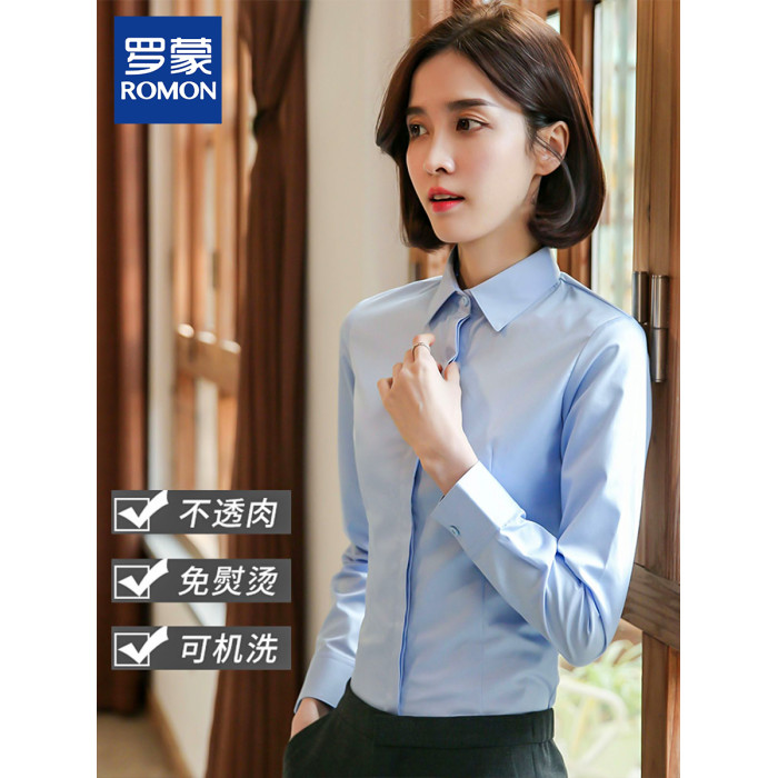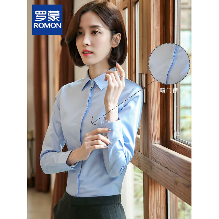 羅矇女士方領藍色職業裝襯衫春秋長袖抗皺免燙工作服上班正裝襯衣