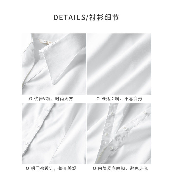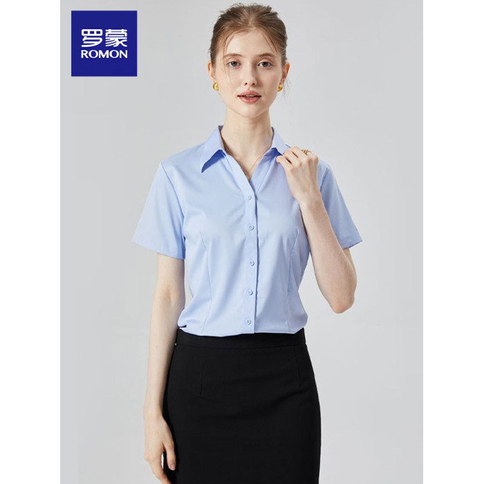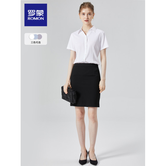 羅矇女士藍色V領短袖襯衫半裙職業套裝夏正裝面試工作服白色襯衣