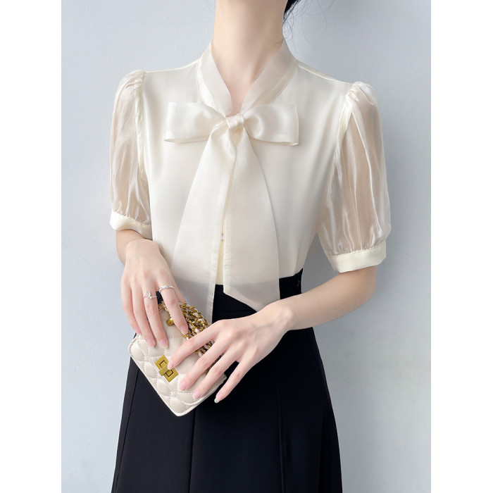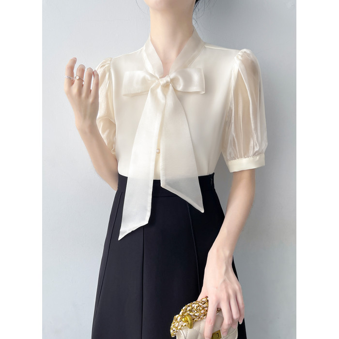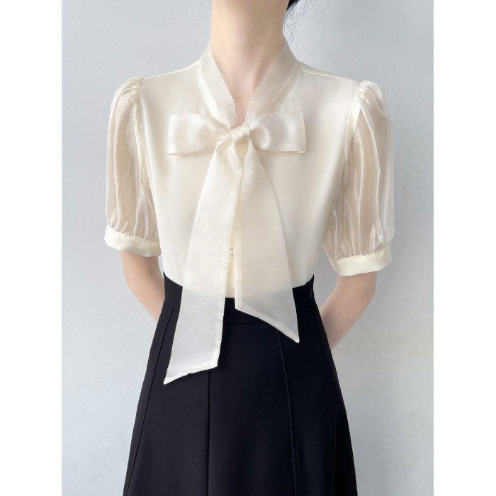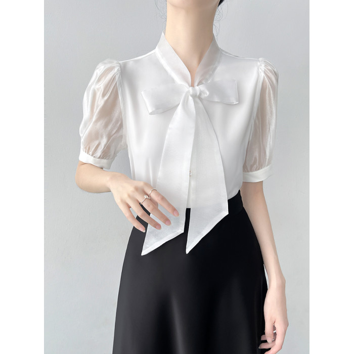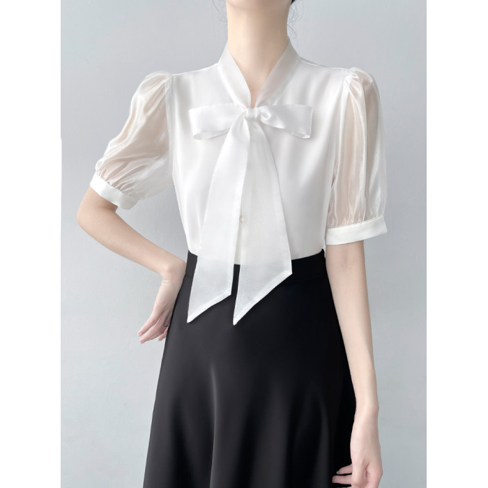 韓帛雅蝴蝶結飄帶白色短袖襯衫女士夏季新款職業通勤法式氣質上衣