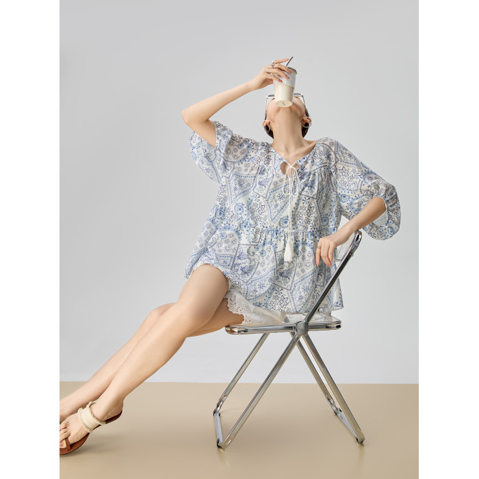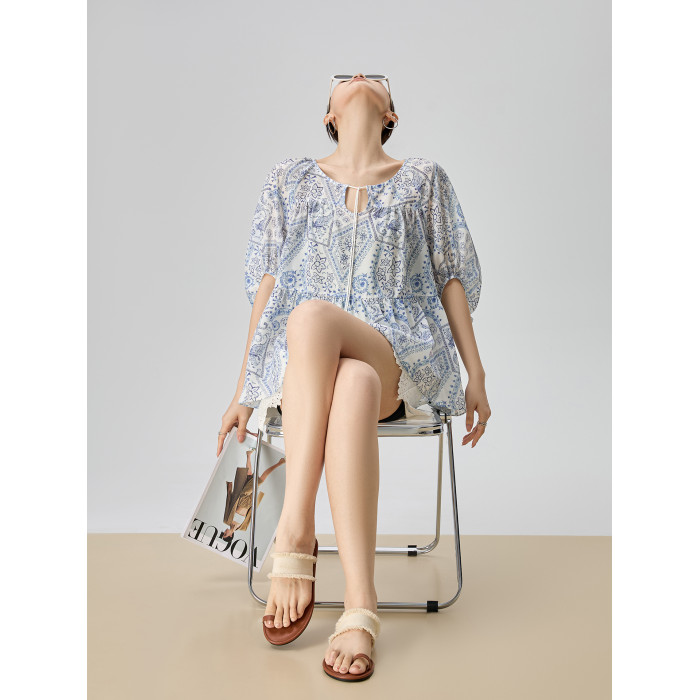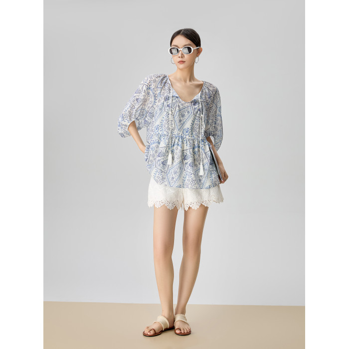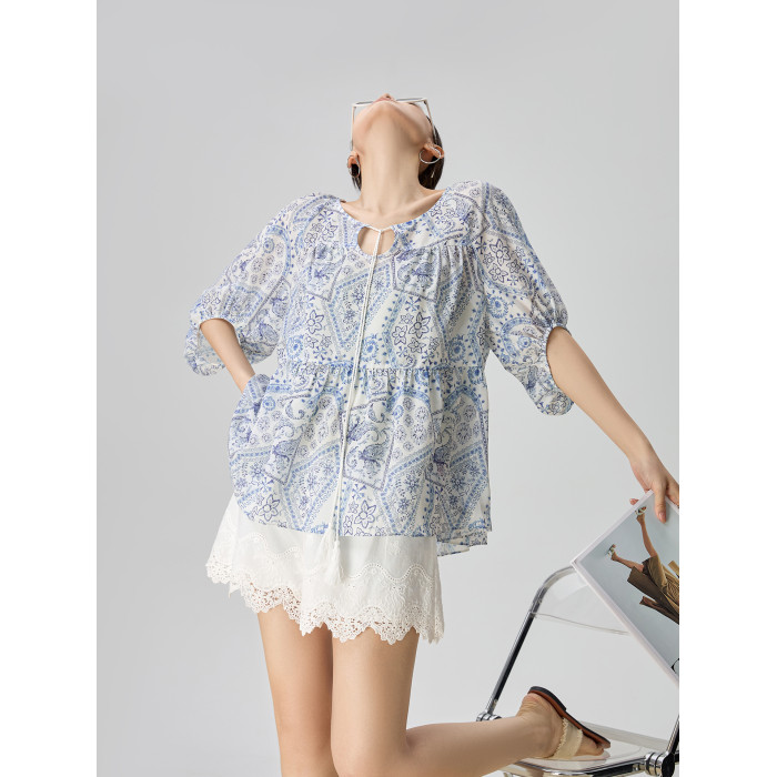 顧裡裡巨好看的夏日藍色印花系帶襯衫女輕熟小衆不撞款設計感上衣