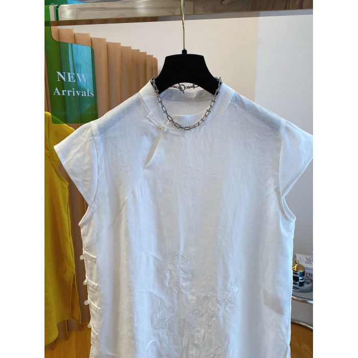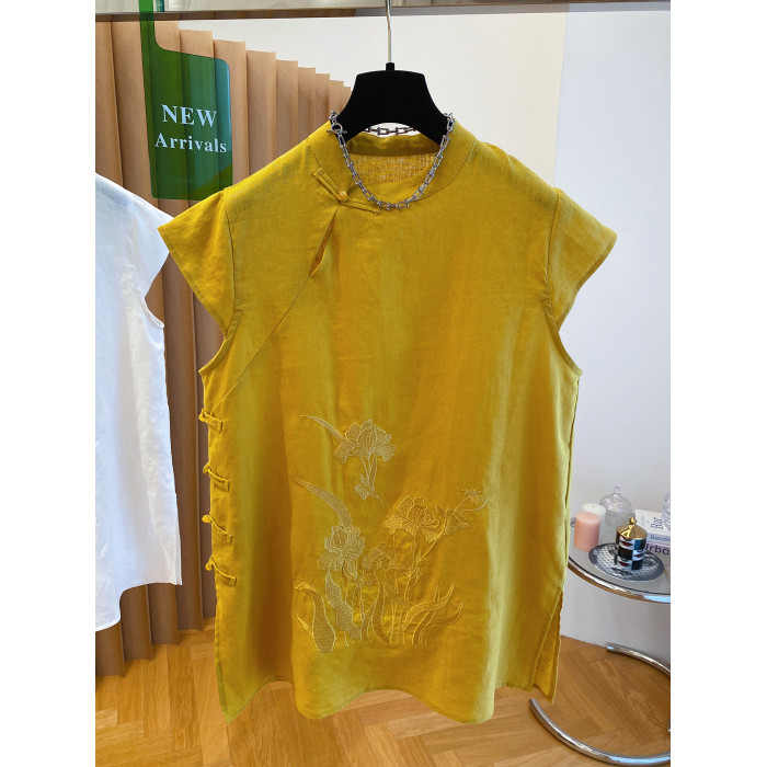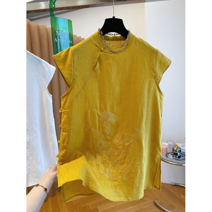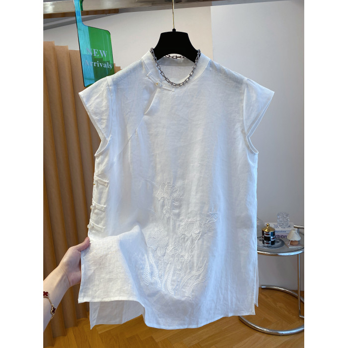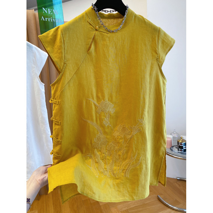 新中式國風盤釦亞麻上衣女夏季2025新款高級寬松坎肩飛袖旗袍襯衫