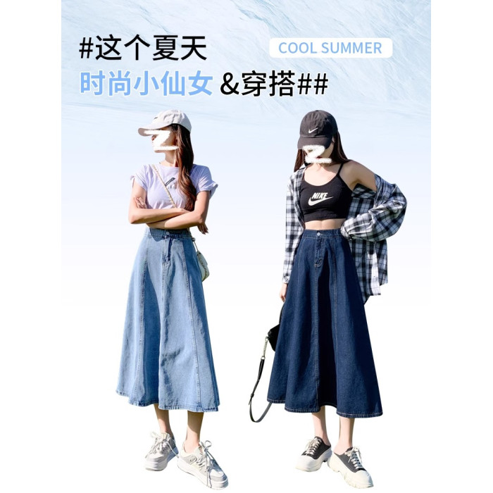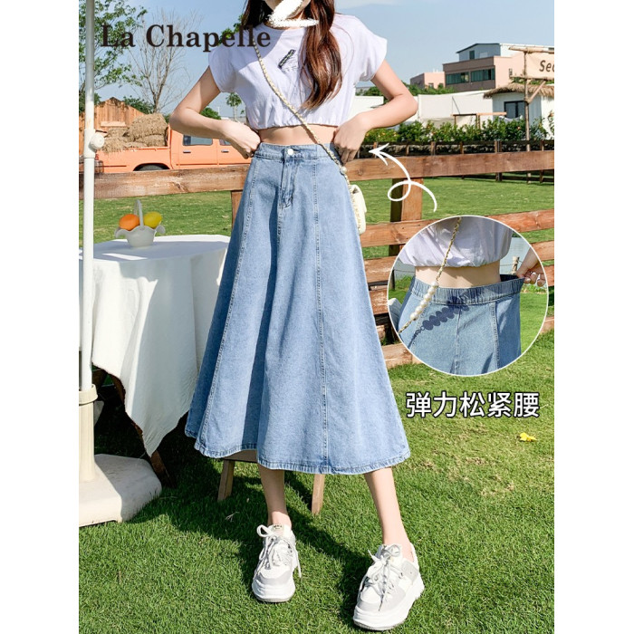 拉夏貝爾淺藍色高腰牛仔半身裙女春夏新款中長款遮胯顯瘦a字繖裙