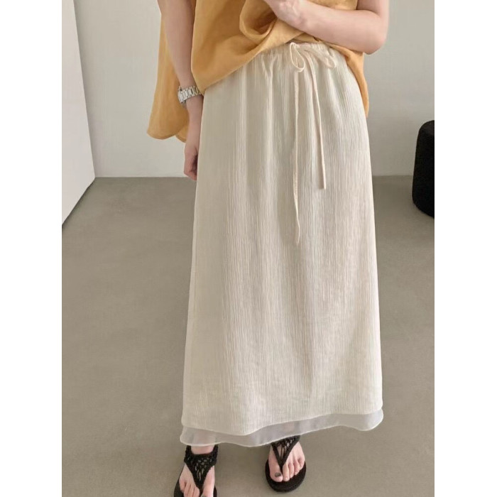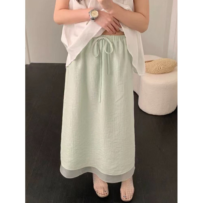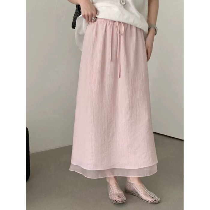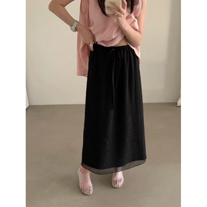 2025夏秋下擺網紗拼接天絲半身裙韓版百搭高腰顯瘦開叉垂感直筒裙