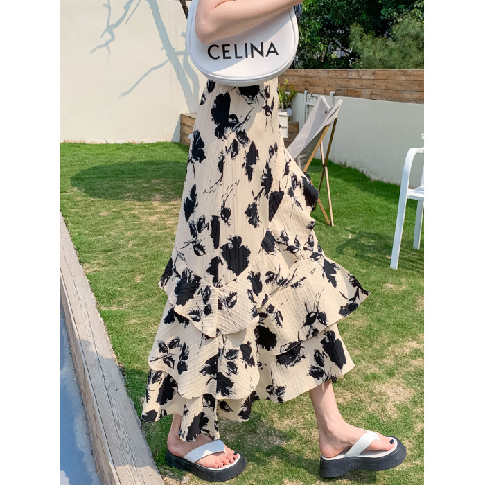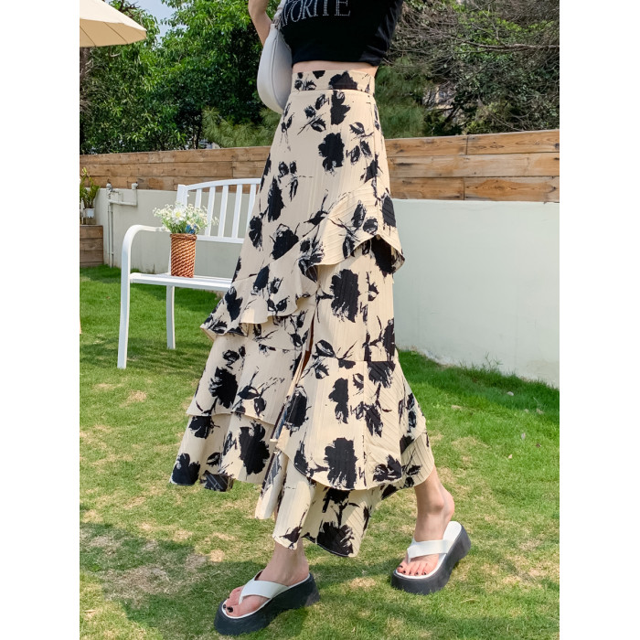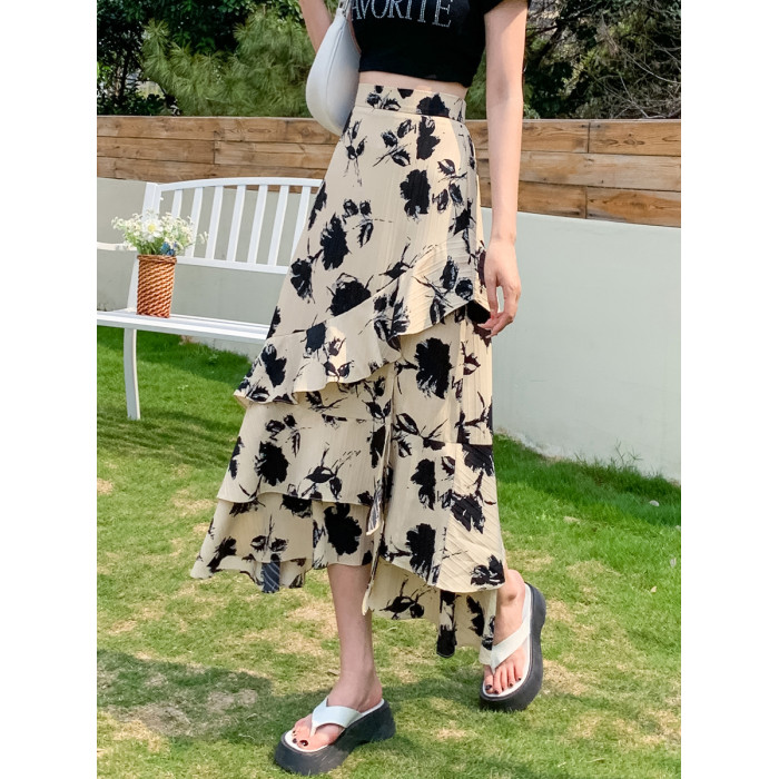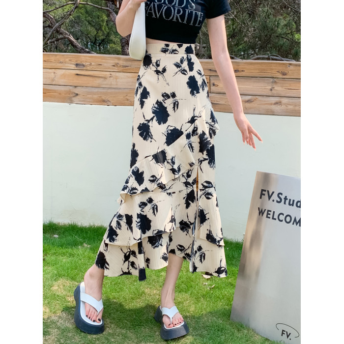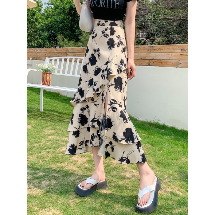 不規則半身裙女夏季2025新款魚尾包臀裙荷葉邊氣質雪紡碎花a字裙