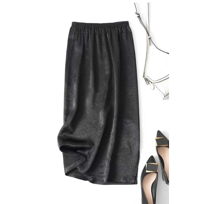 新中式肌理感黑色緞面半身裙女夏薄款高腰中長款後開叉直筒包臀裙