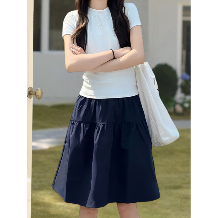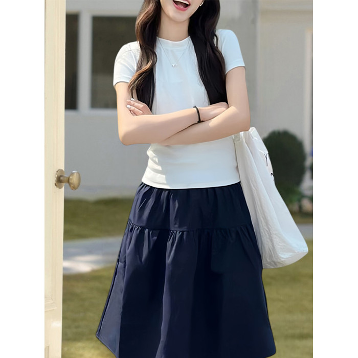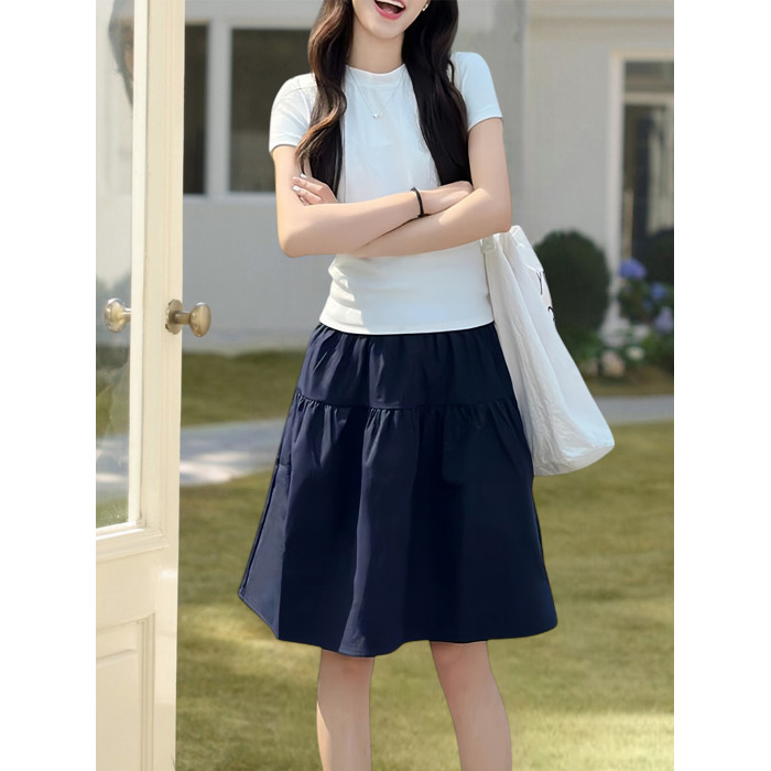 Basic House/百家好藏青色高腰蓬蓬短裙女士夏季寬松防走光A字裙