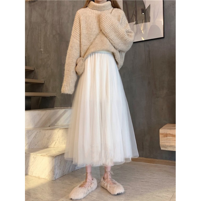 2025早秋新款半身裙子仙女絕美網紗蓬蓬裙中長芭蕾風秋冬白色紗裙