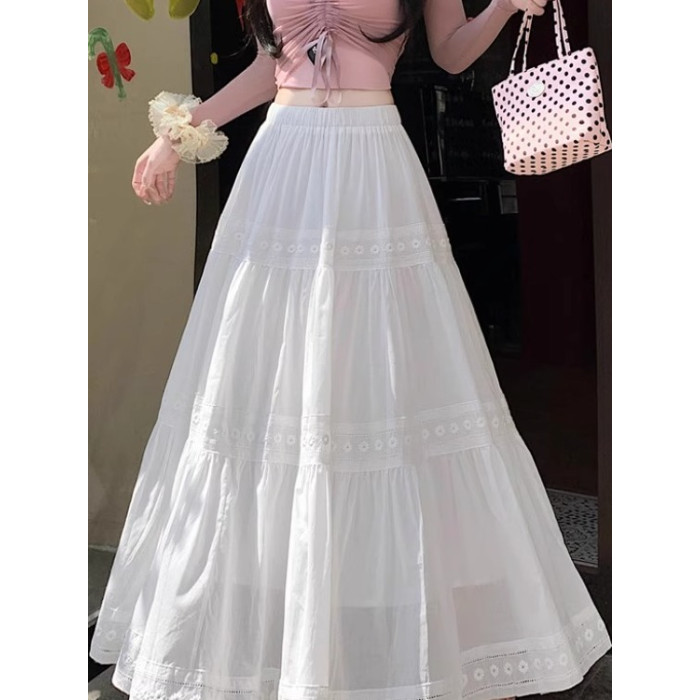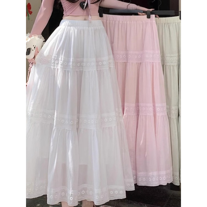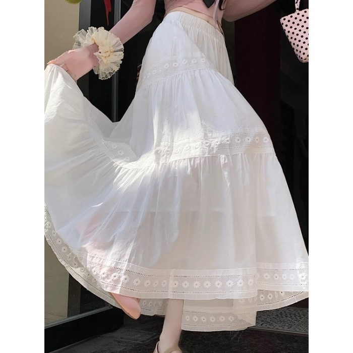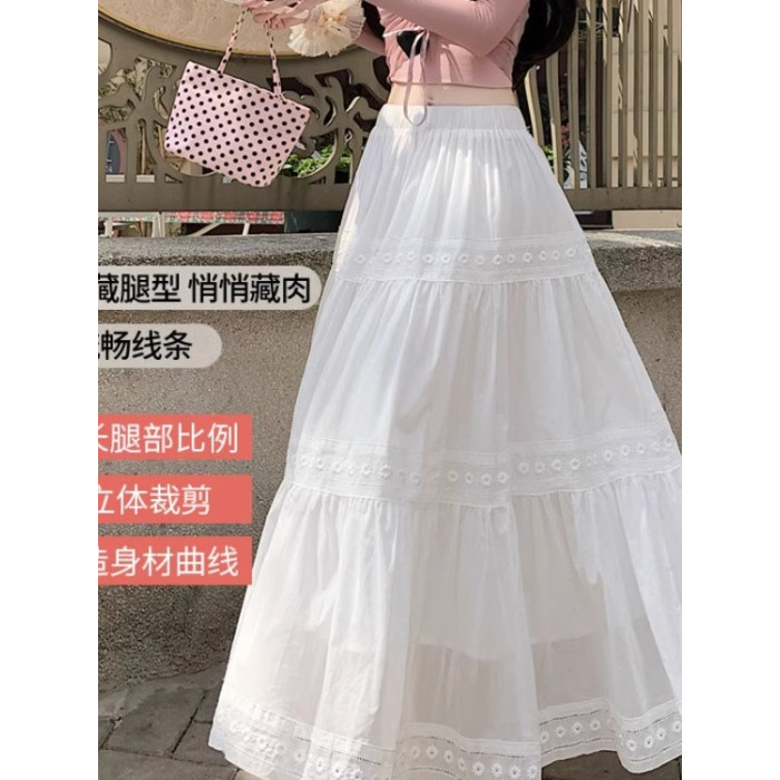 法式溫柔風蕾絲拼接半身裙女夏高腰遮肉顯瘦小白裙綉花百褶大擺裙
