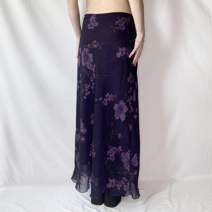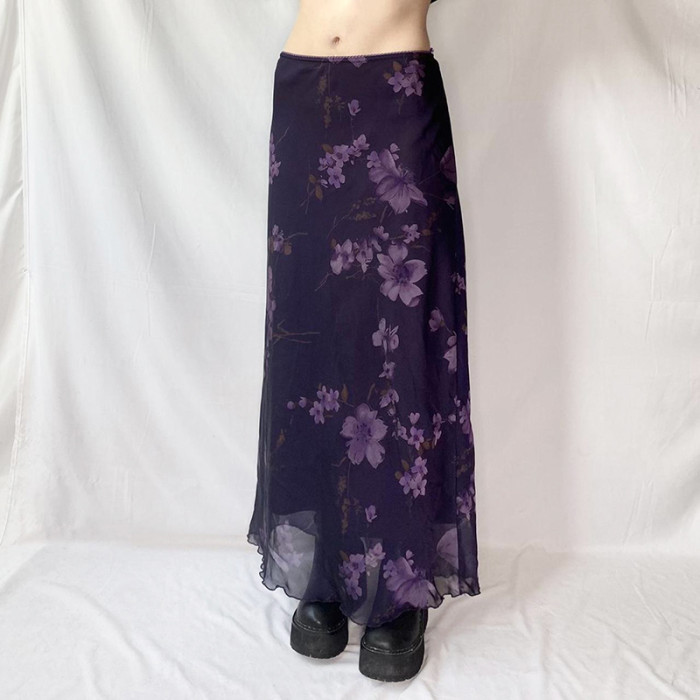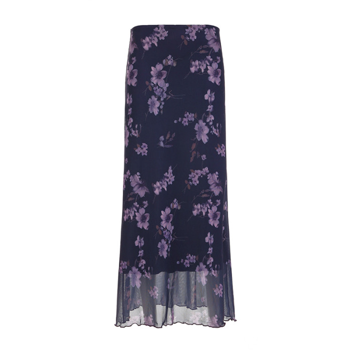 MSYOUCAN 昭和紫櫻物語復古印花半身裙網紗拼接A字百搭小衆長裙女