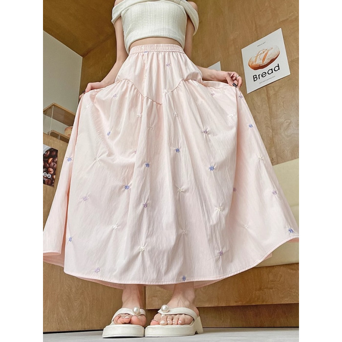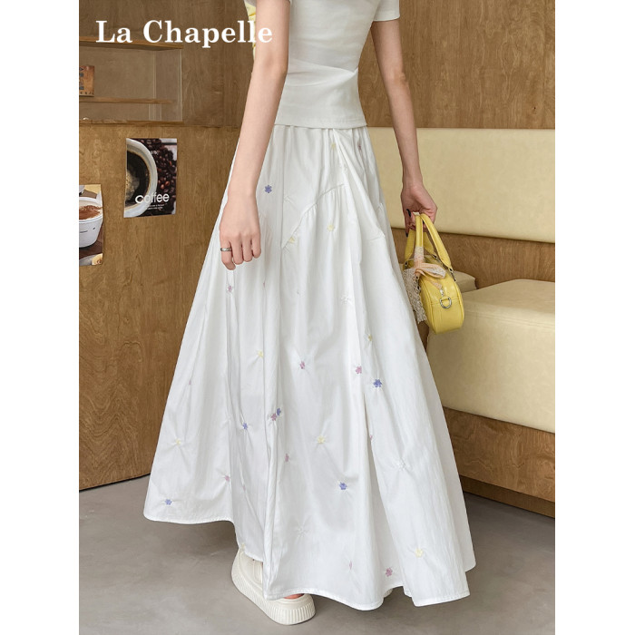 拉夏貝爾白色碎花刺綉冰絲半身裙女夏松緊腰a字遮胯時尚甜美長裙