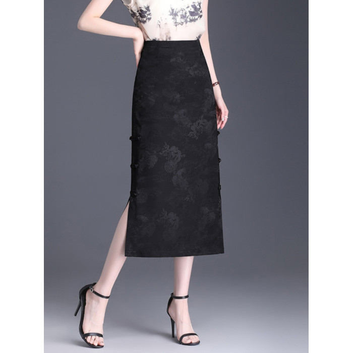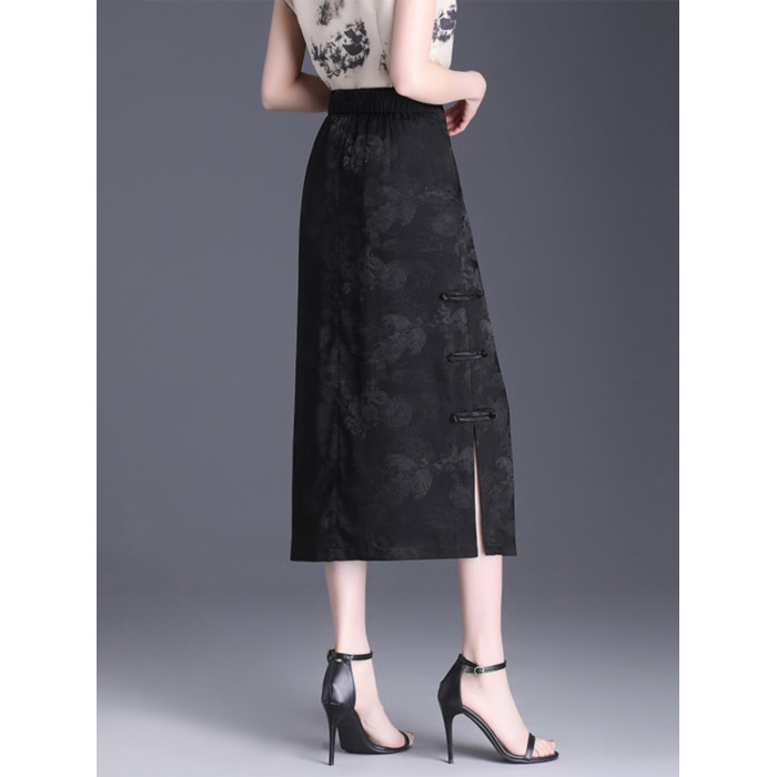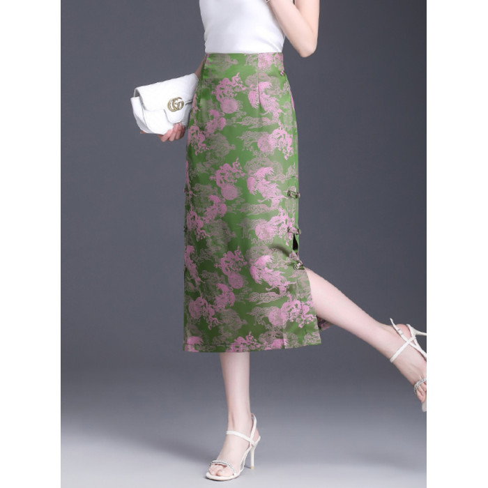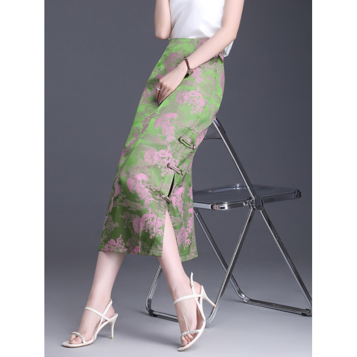 國風新中式印花半身裙女2025夏新款顯瘦中長盤釦旗袍式包臀裙薄款
