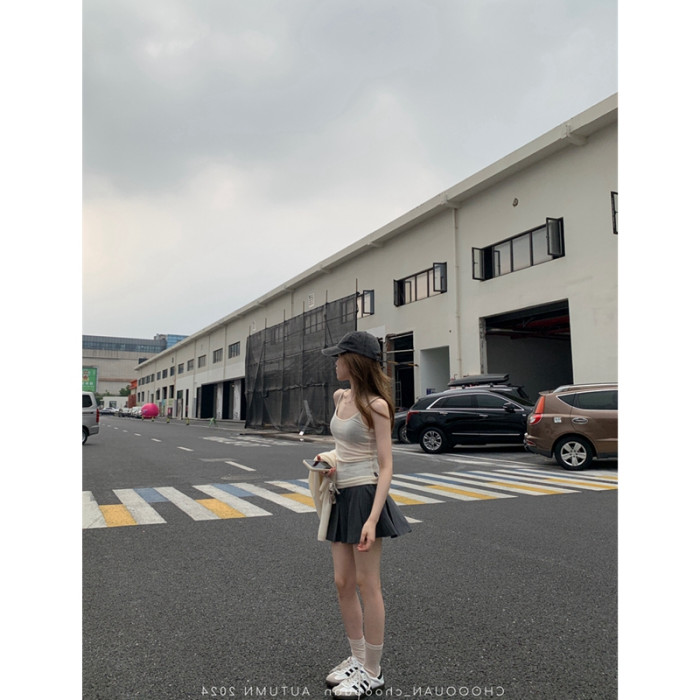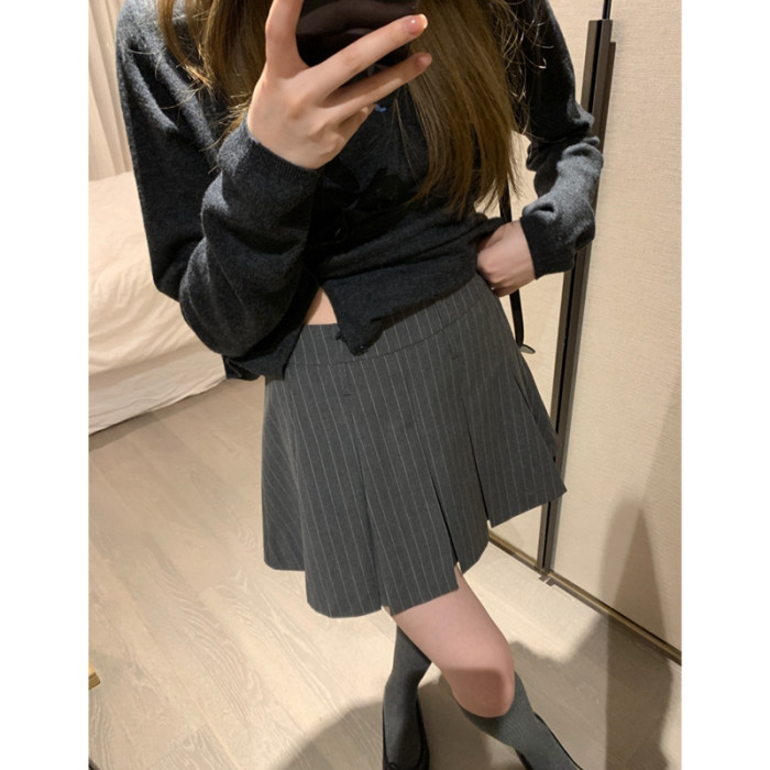 miu系學院 仿毛TR面料 雙腰袢條紋百褶短裙(帶安荃褲)
