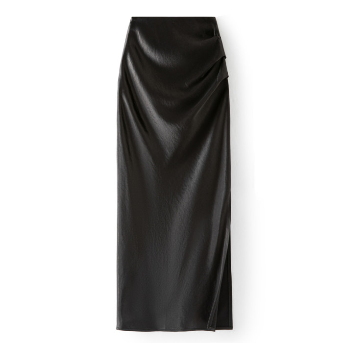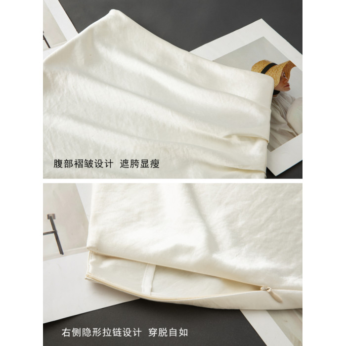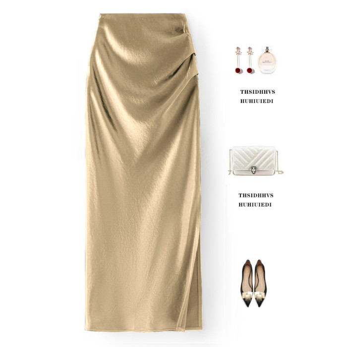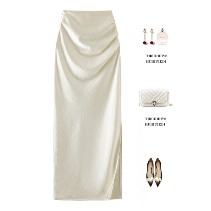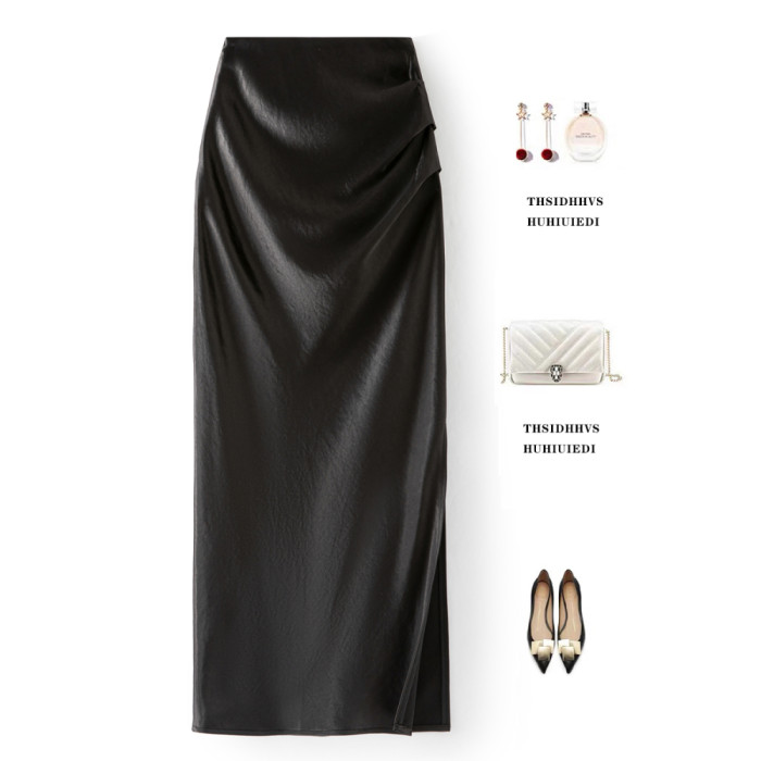 KK家/半身裙女2025夏季新款醋酸緞面褶皺直筒裙側開叉顯瘦一步裙