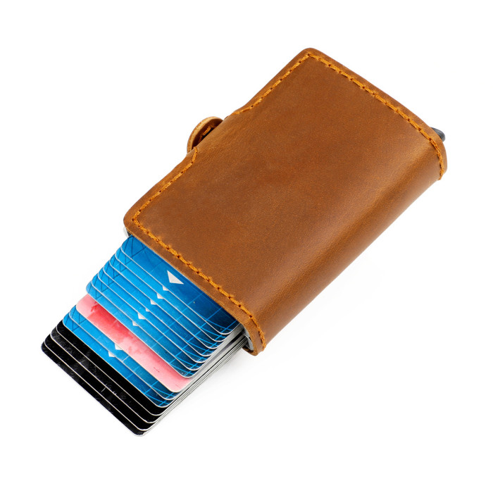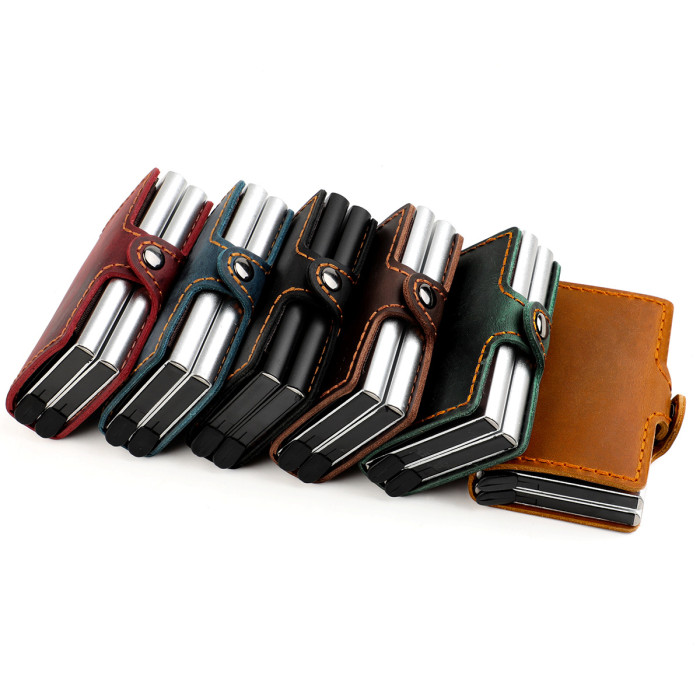 瘋馬皮鋁盒雙層卡包 防盜刷自動彈出卡包創意手工美金夾真皮卡套