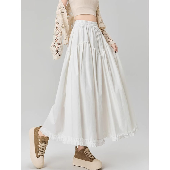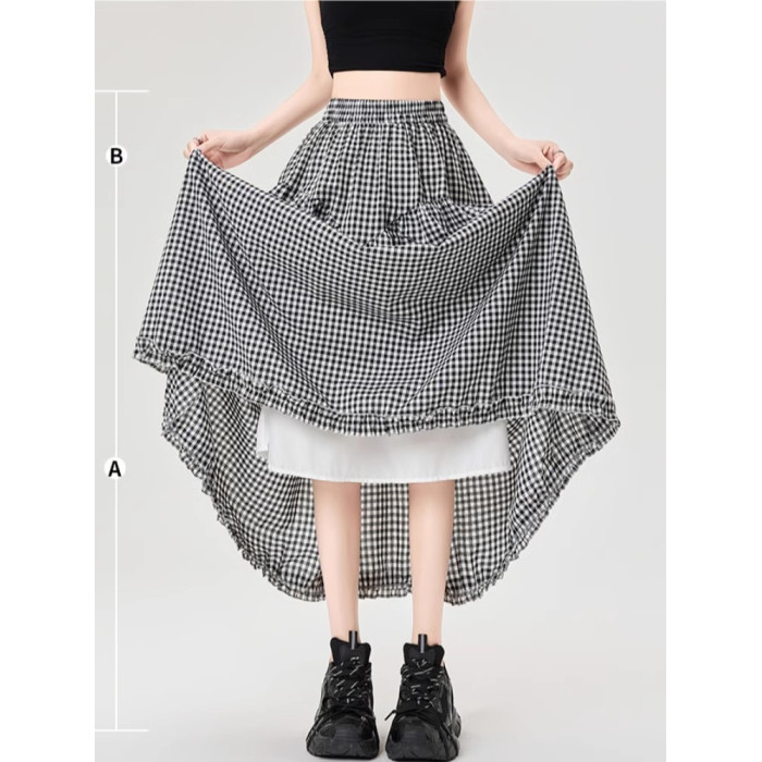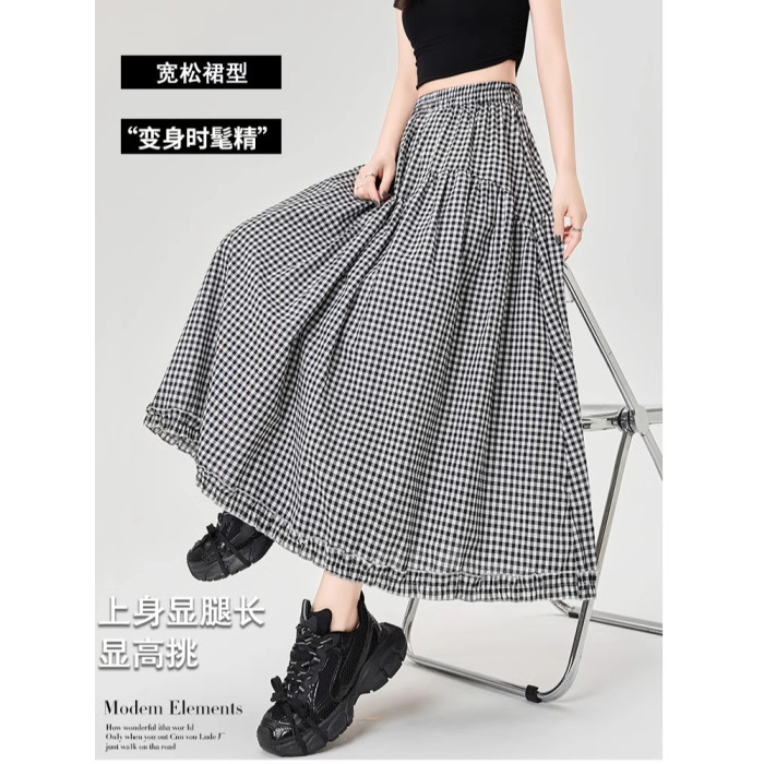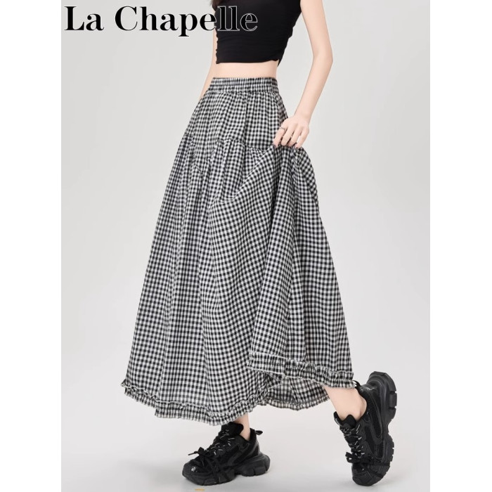 拉夏貝爾木耳花邊復古格子半身裙女春夏2025新款高腰a字休閒長裙