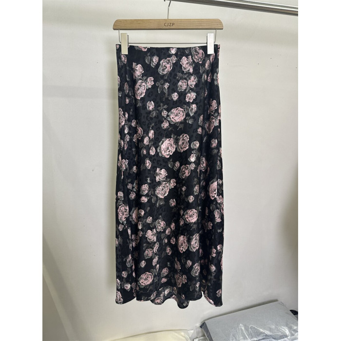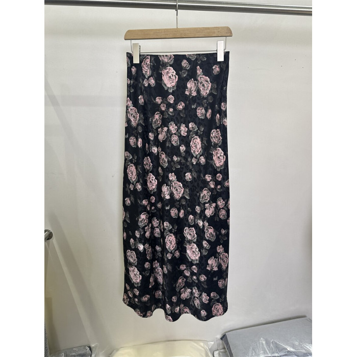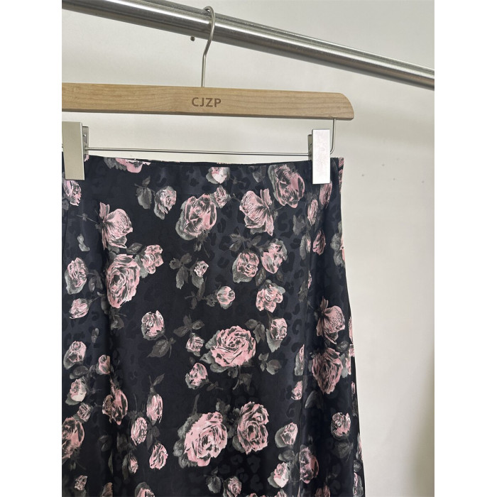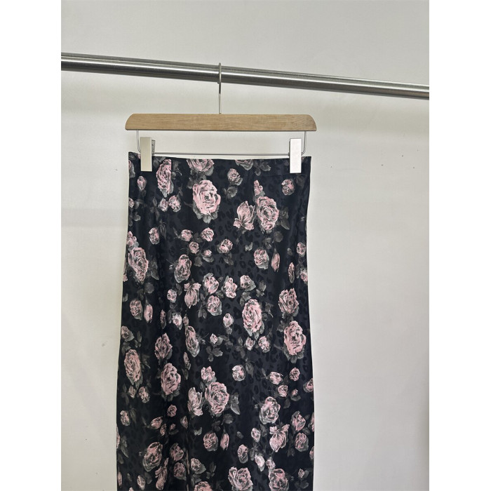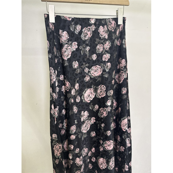 歐貨68161夏裝高腰顯瘦玫瑰印花側開叉天絲中長半身裙女一步裙子