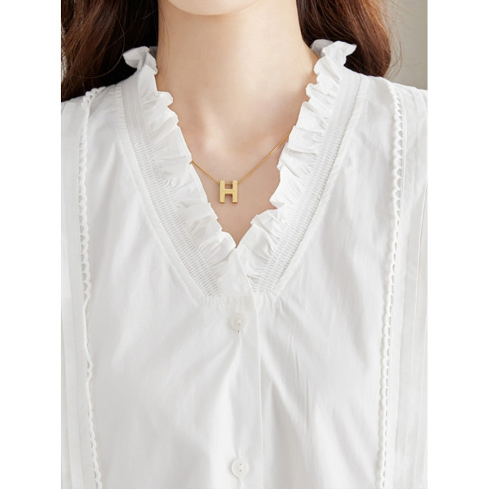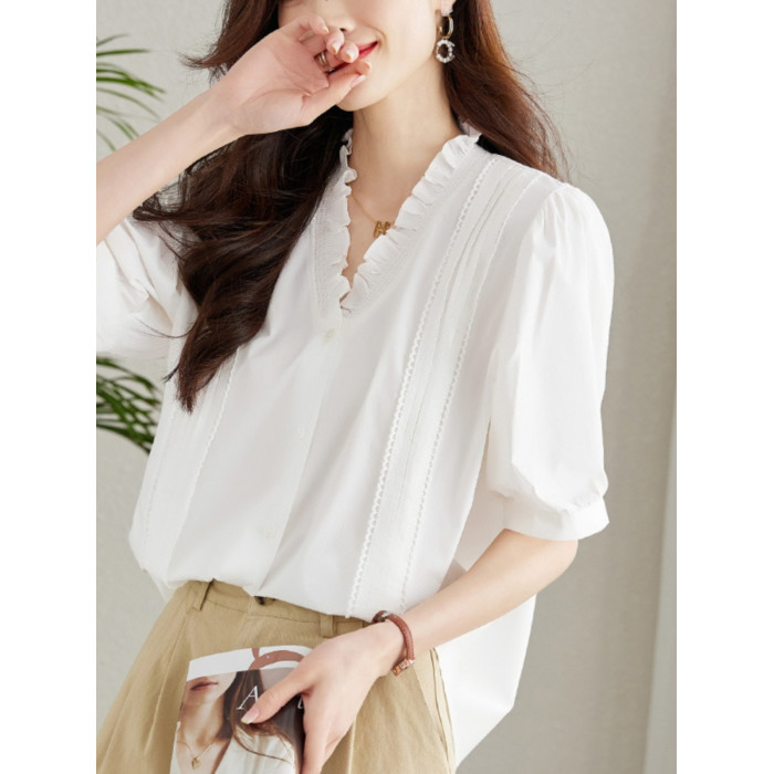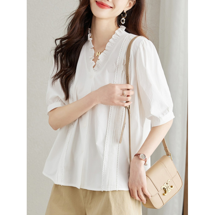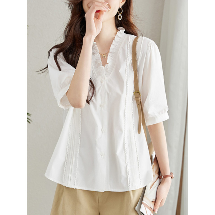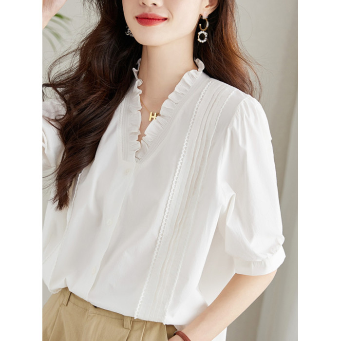 2025夏純棉短袖襯衫女減齡白色v領襯衣女設計感小衆上衣時尚洋氣
