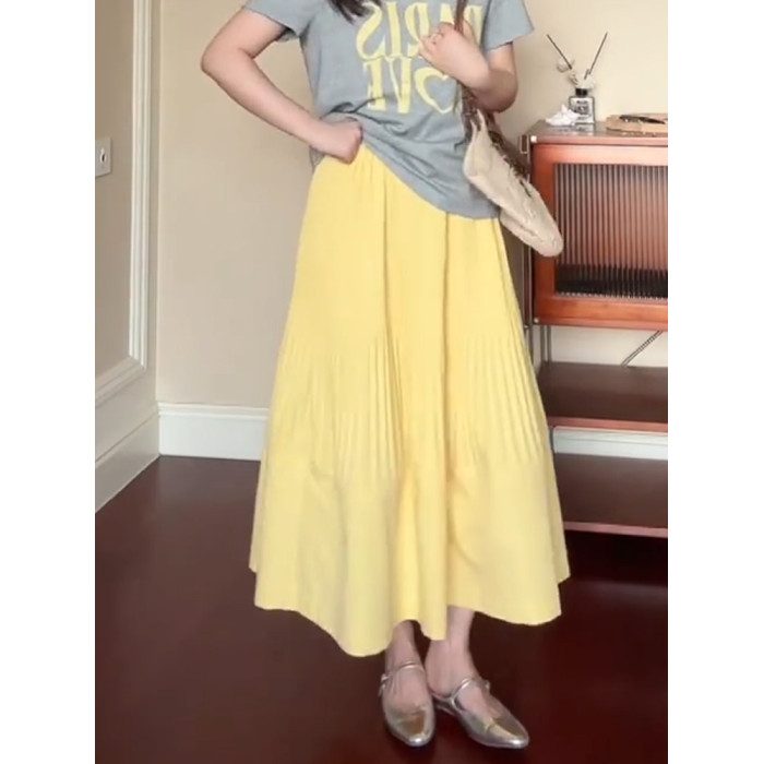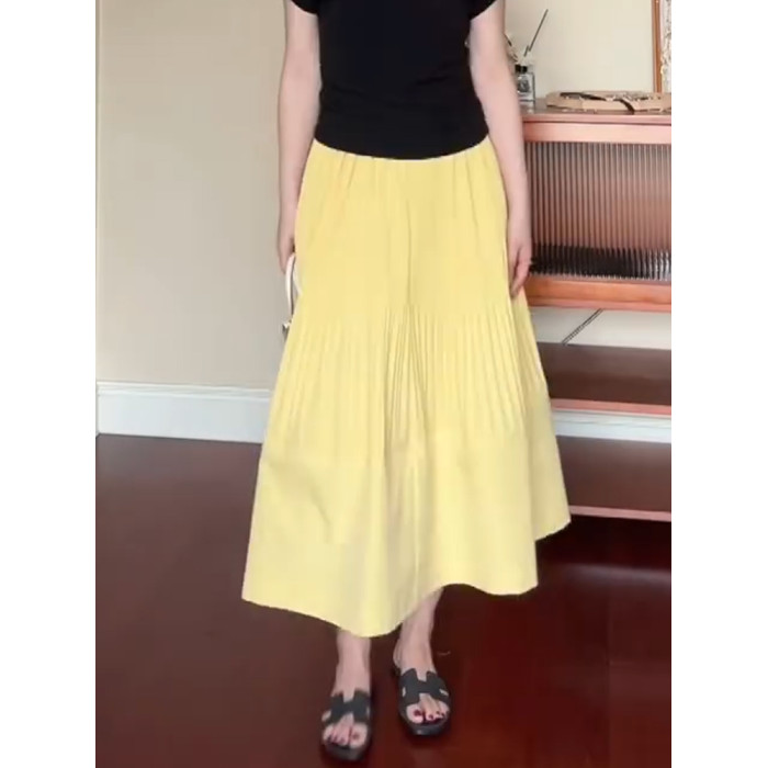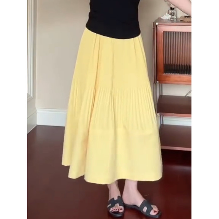 96Kiuo 25秋季新品 赫本美學氛圍感繖狀抗皺壓褶飄逸奶黃色半身裙
