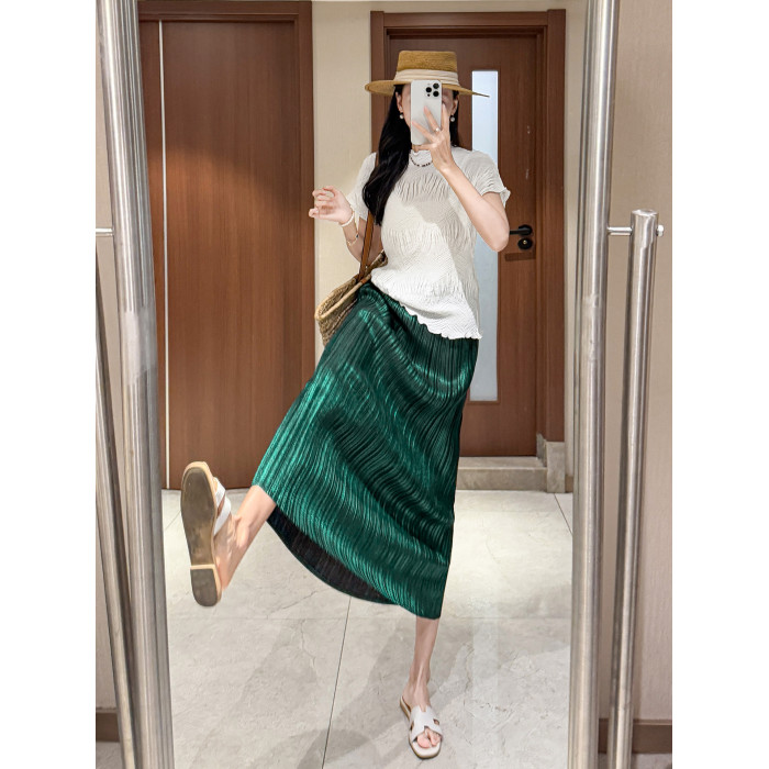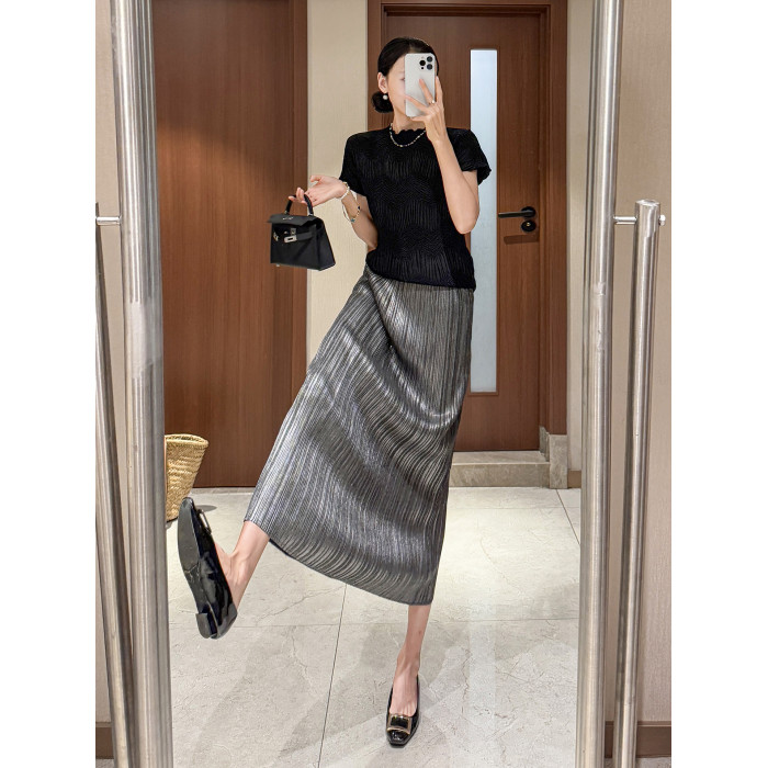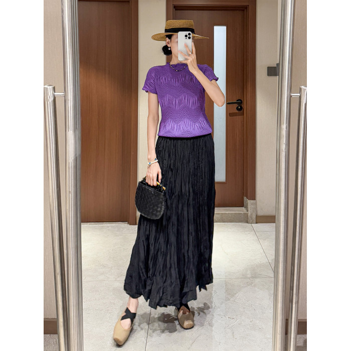 韓女士夏季高級感短袖黑色t恤褶皺半身裙子氣質穿搭一整套裝