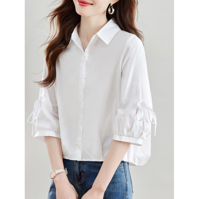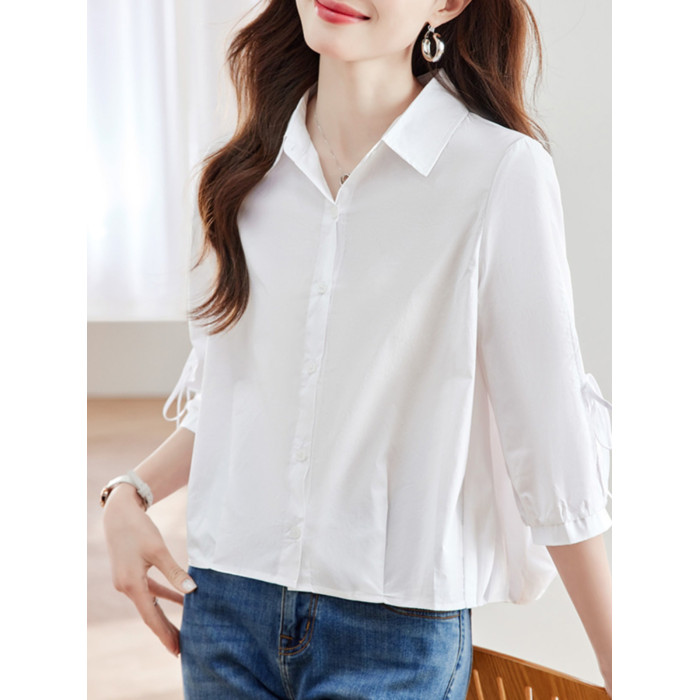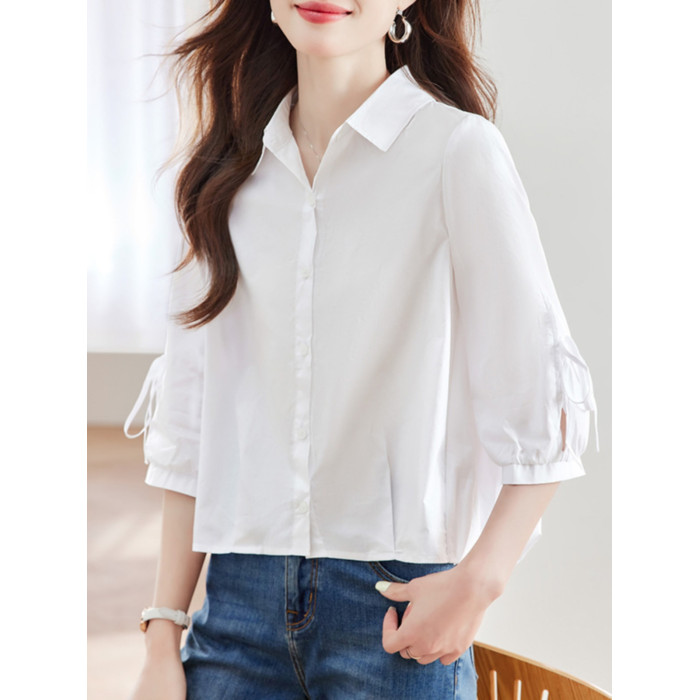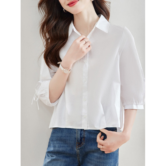 2025夏新款白襯衫女中袖短款小個子上衣七分袖設計感洋氣別致全棉