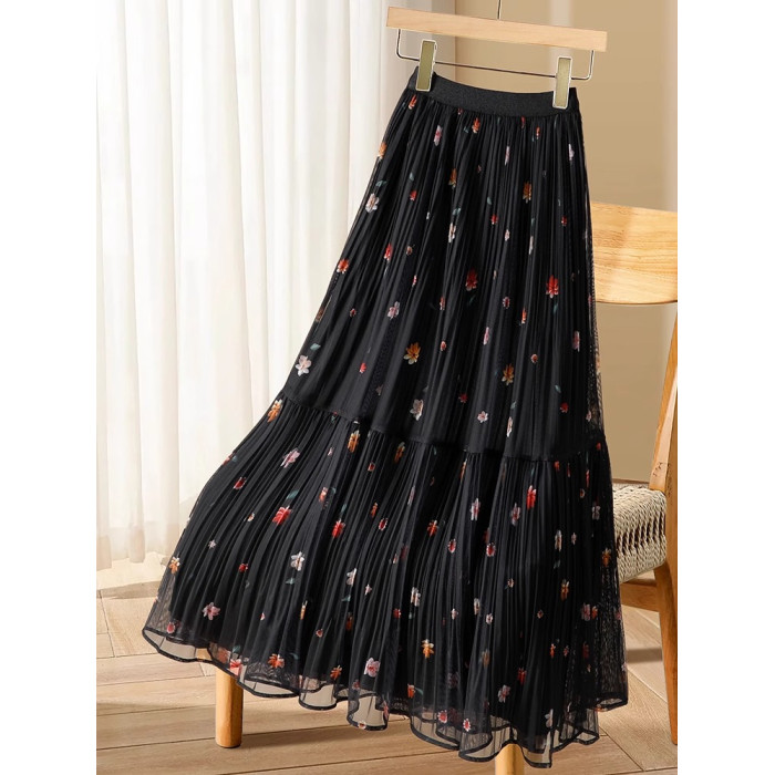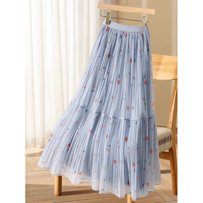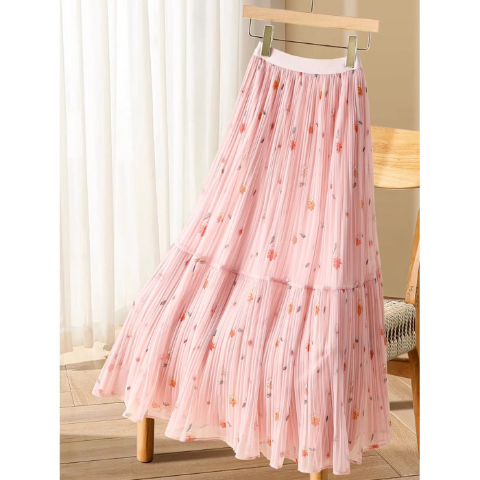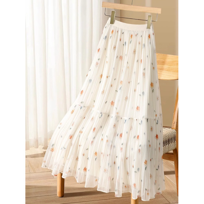 高級網紗碎花半身裙女2025春夏新款高腰顯瘦中長款百褶裙大擺紗裙