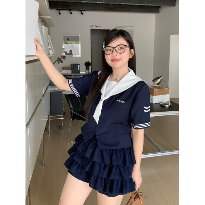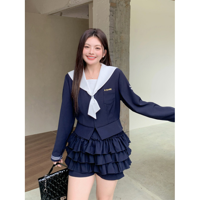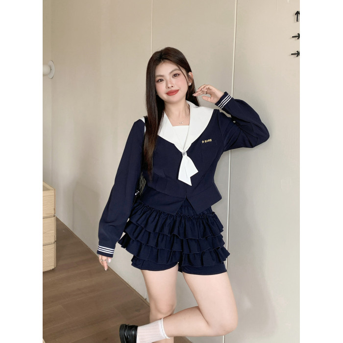阿車家的大碼jk原創學院風海軍領水手服顯瘦百搭蛋糕裙短裙套裝夏