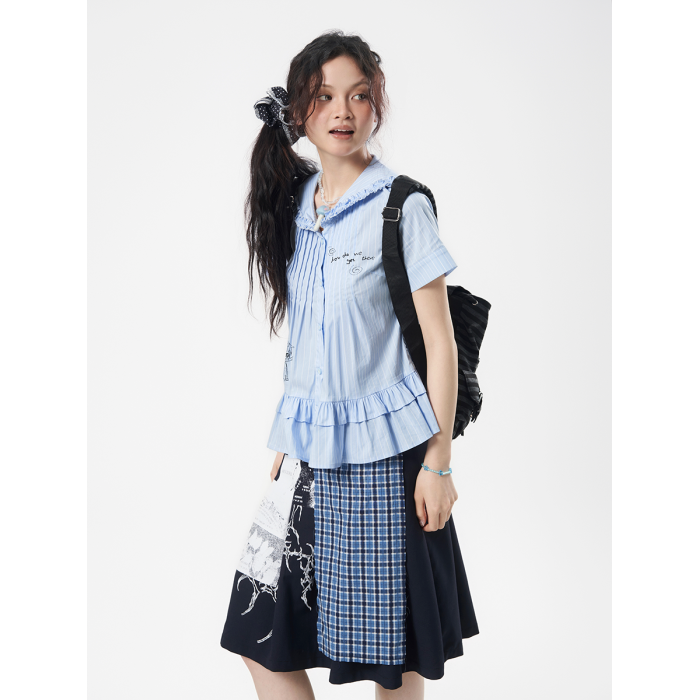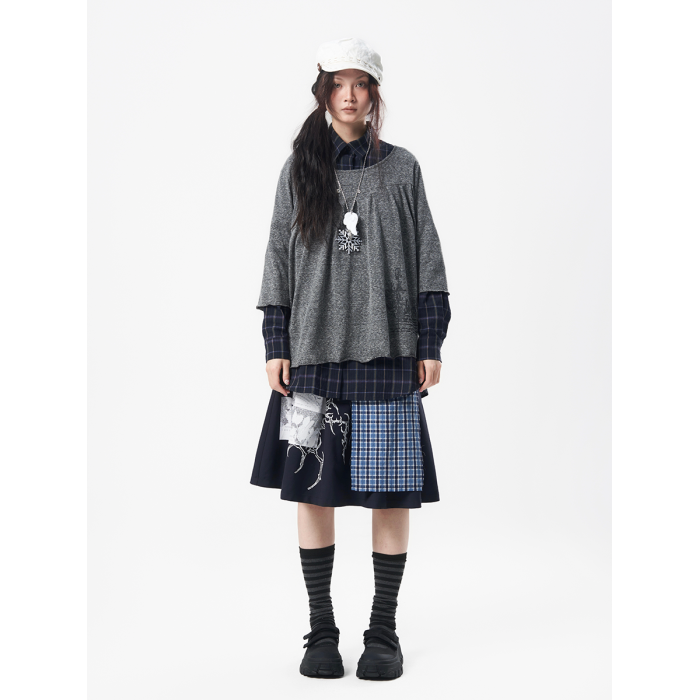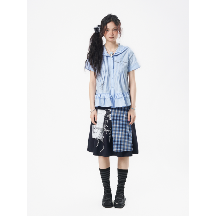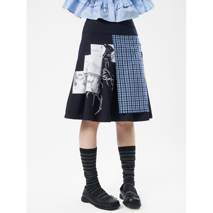 About girl藏青色不規則格紋掛布印花半身裙輕亞y2k顯高