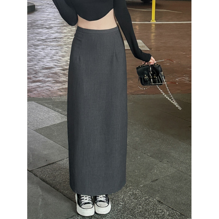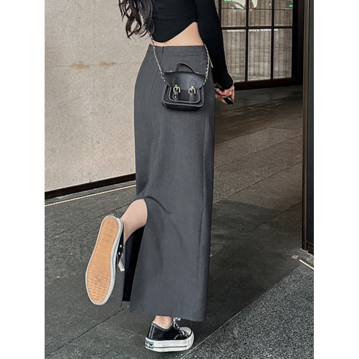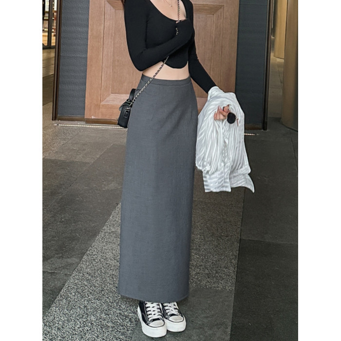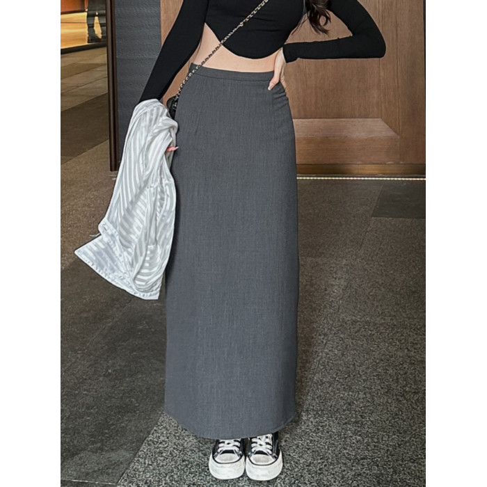 灰色西裝垂感半身裙長裙女春夏黑色直筒裙高腰顯瘦長款後開叉裙子