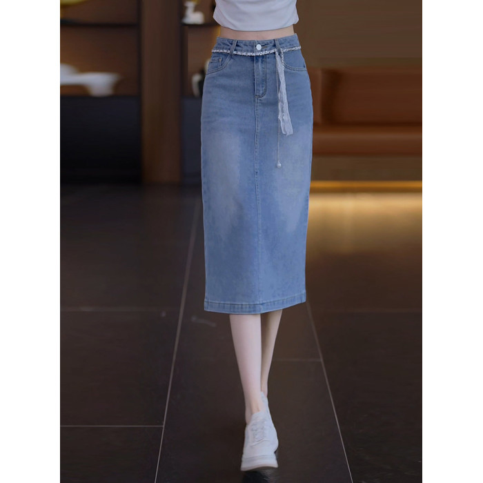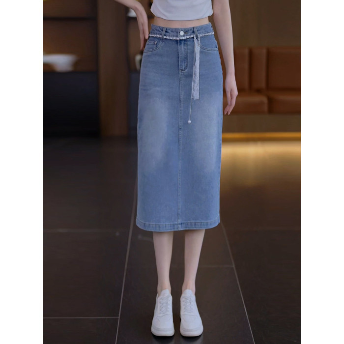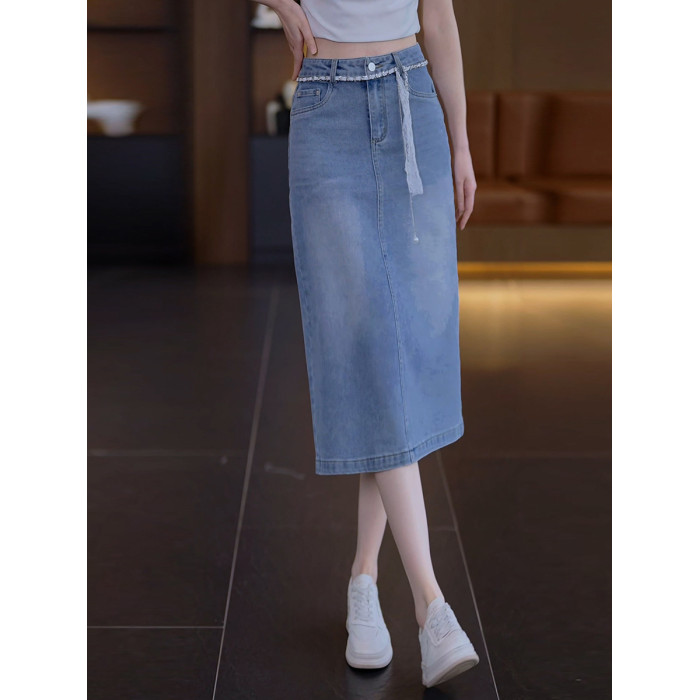 隅見丨牛仔半身裙女夏薄款2025新款系帶高腰直筒後開叉包臀一步裙