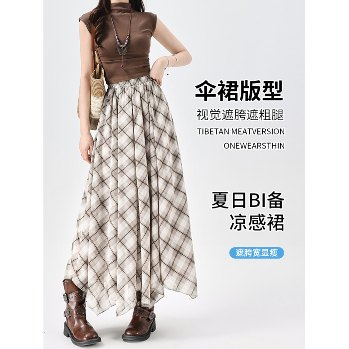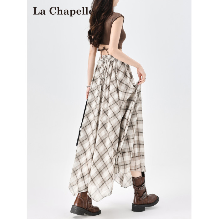 拉夏貝爾不規則復古格子半身裙女夏薄款小衆設計感垂墜感a字繖裙