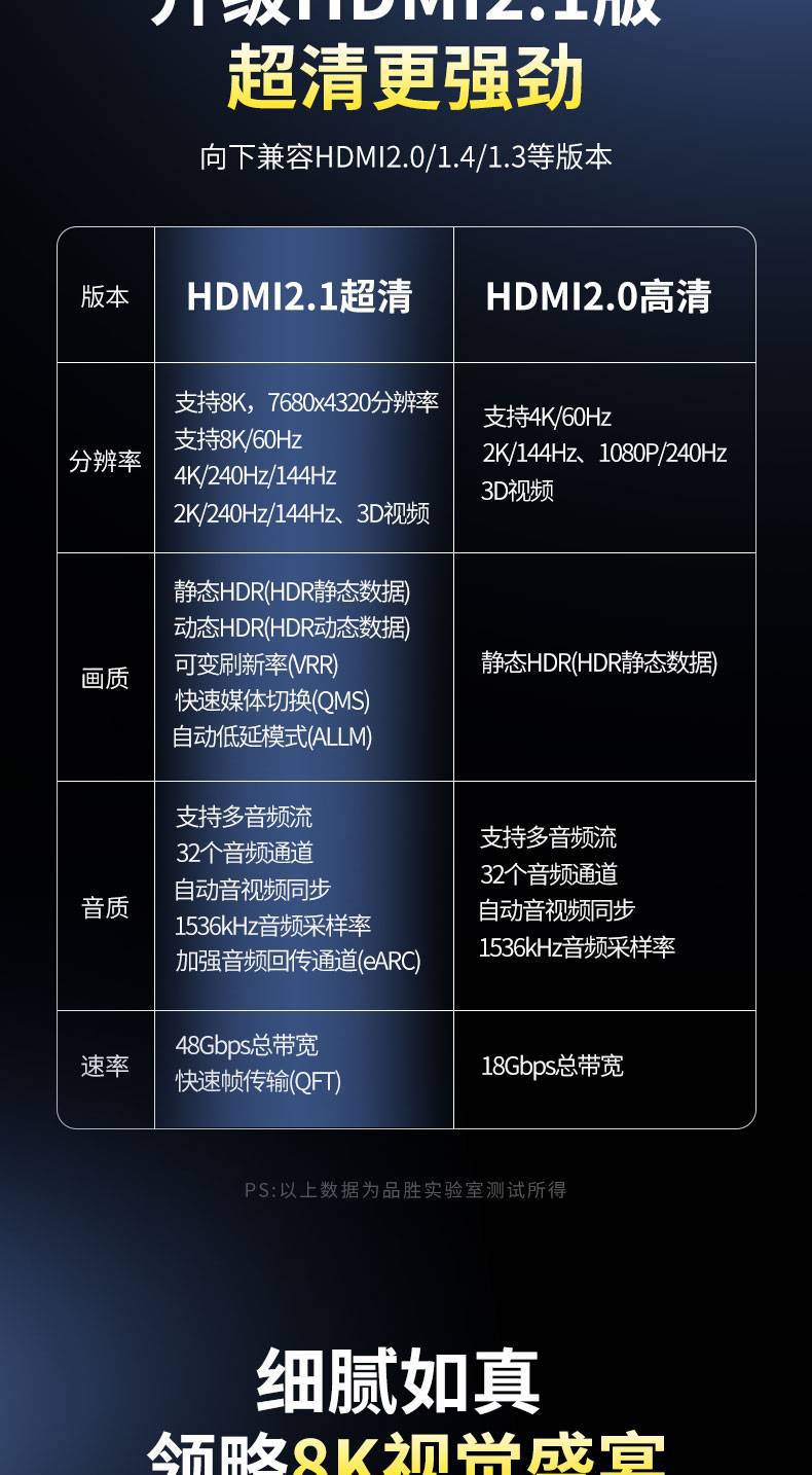 品勝HDMI線8K真高清HDMI2.1電腦顯示器桌上型機機頂盒投影儀連接線