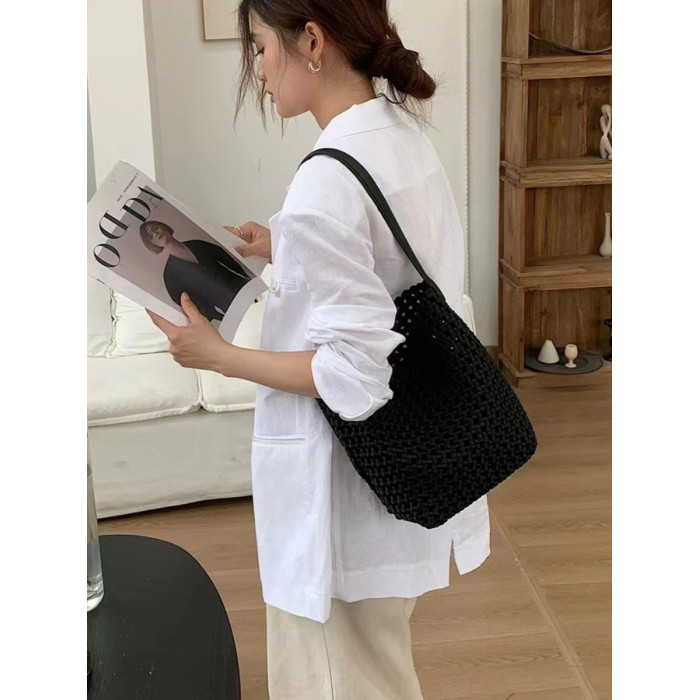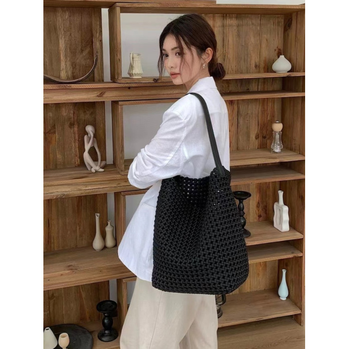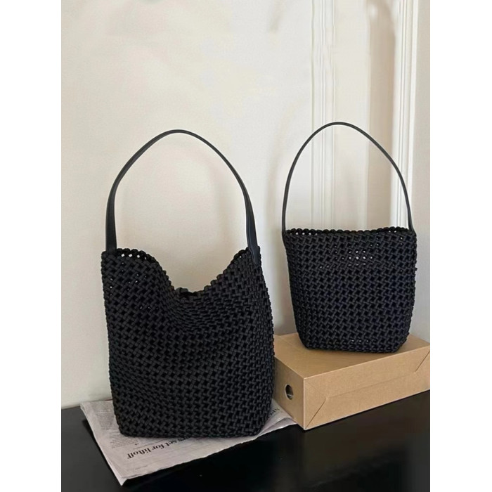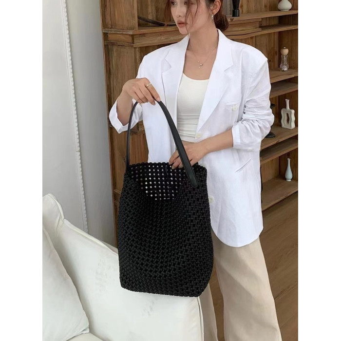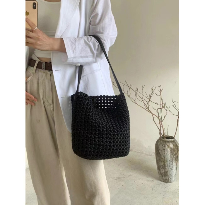高定綢緞復古鏤空設計女包手工編織大容量托特水桶通勤子母單肩包