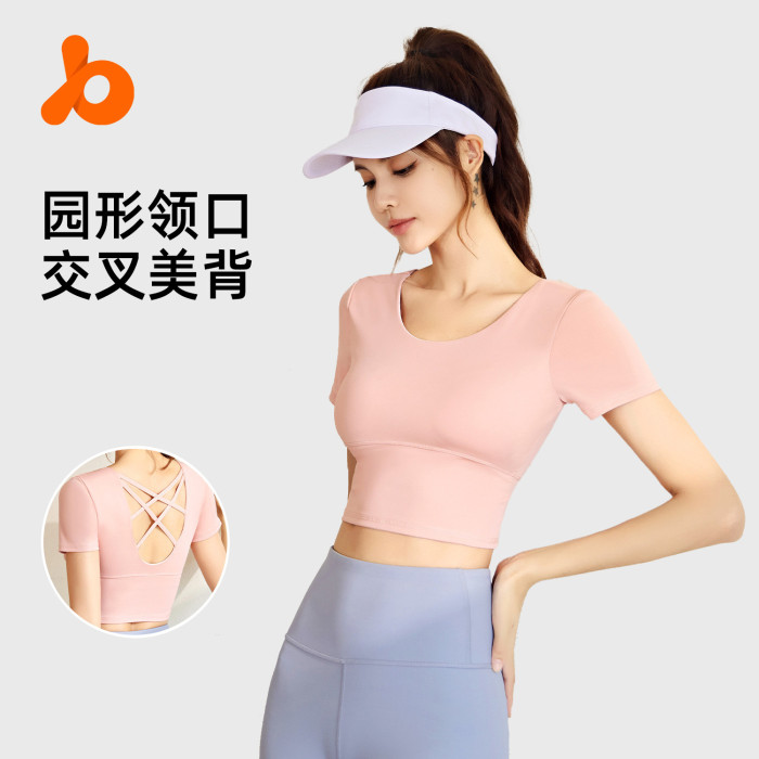 聚衣堂美背瑜伽服短袖緊身顯瘦運動上衣女裸感帶胸墊健身衣