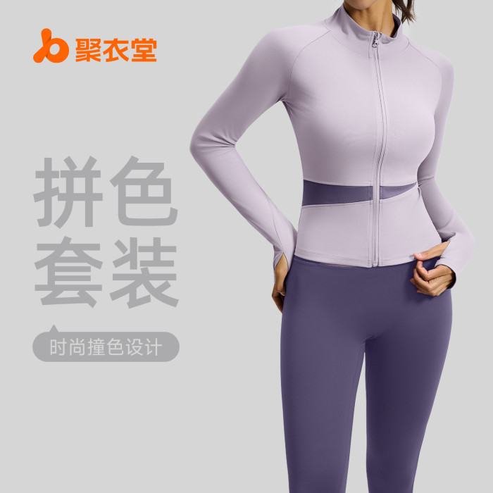 聚衣堂蜜桃拼色兩件套裸感高彈跑步修身運動瑜伽服