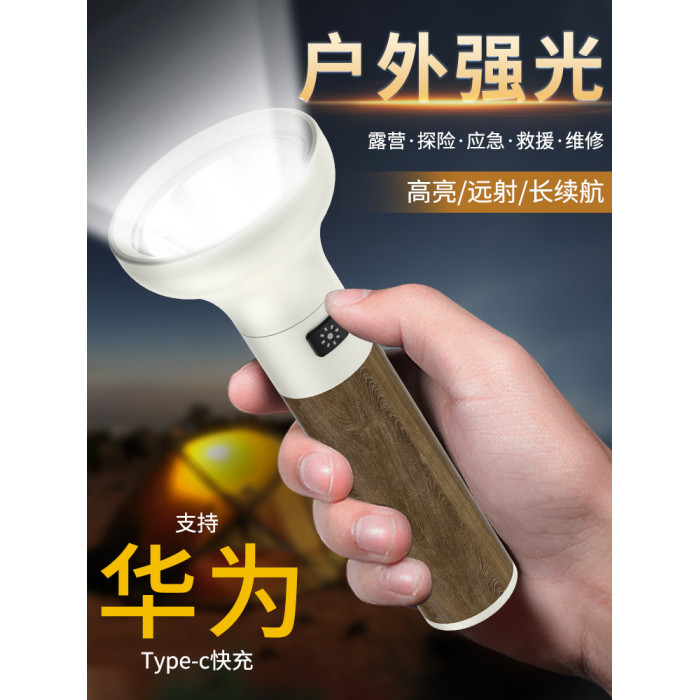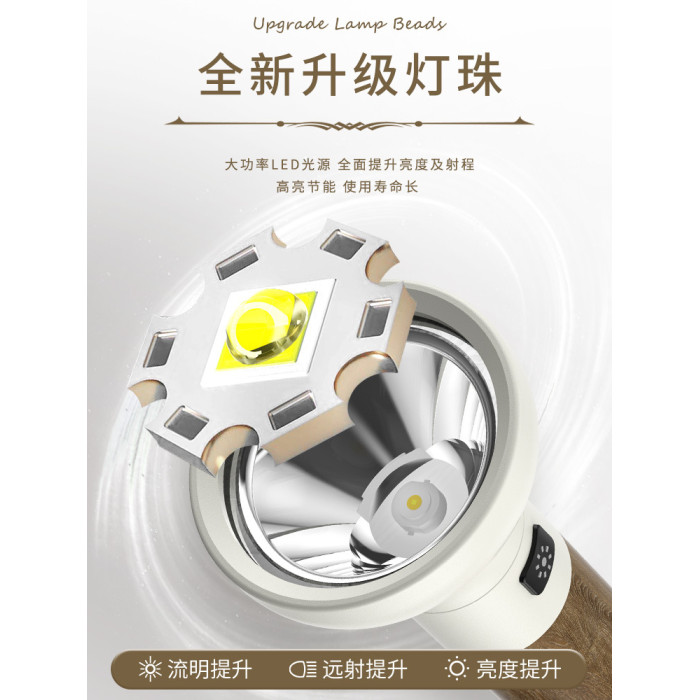 新款復古木紋強光手電 戶外LED充電可攜式家用照明應急手電筒