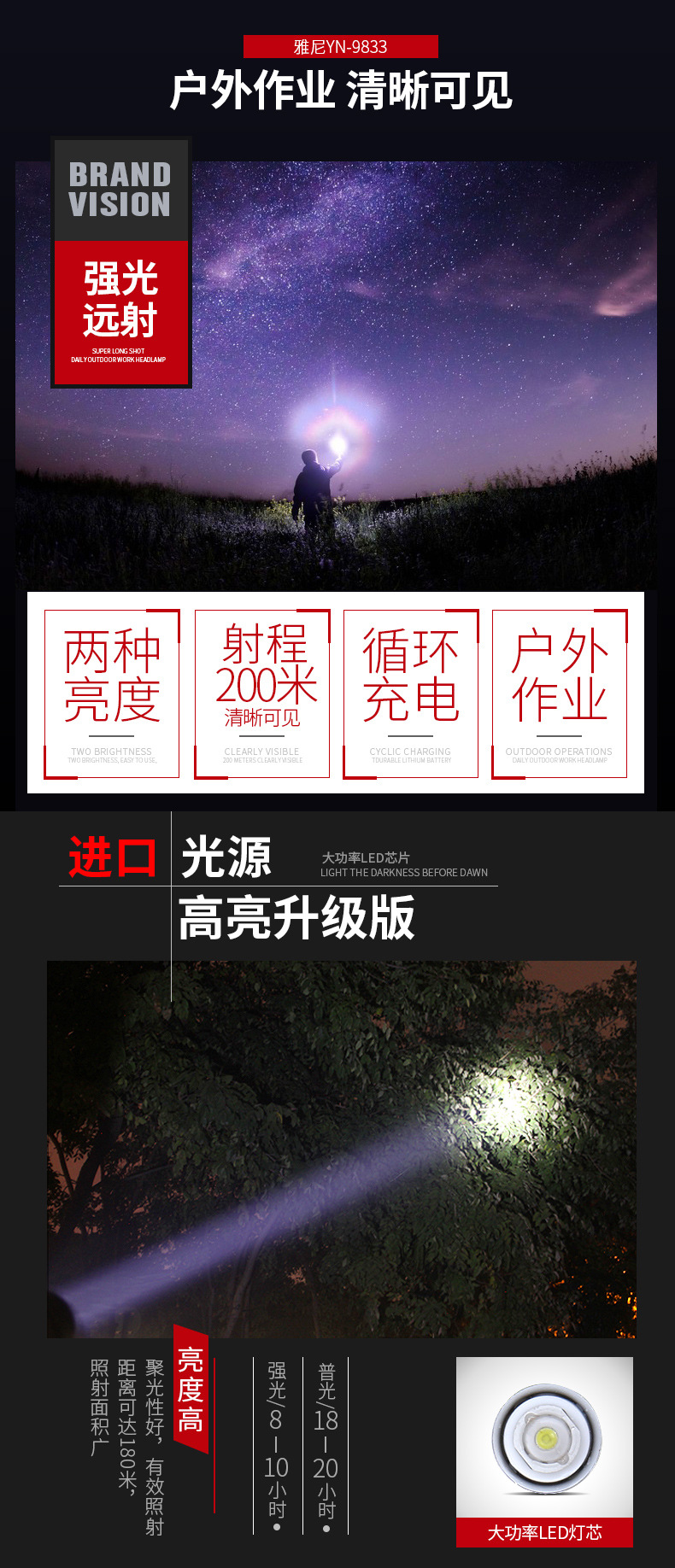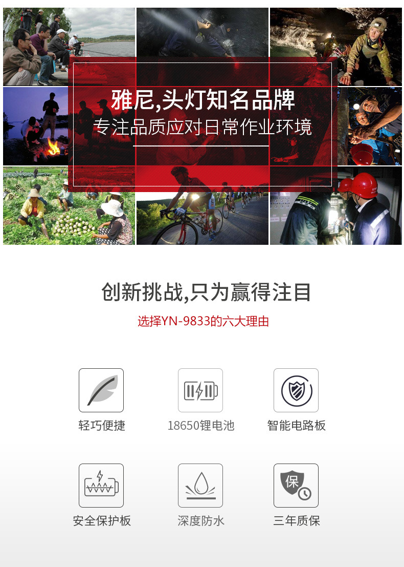 雅尼9833輕便頭燈強光充電超亮頭戴式超輕小號LED夜釣魚礦工照明