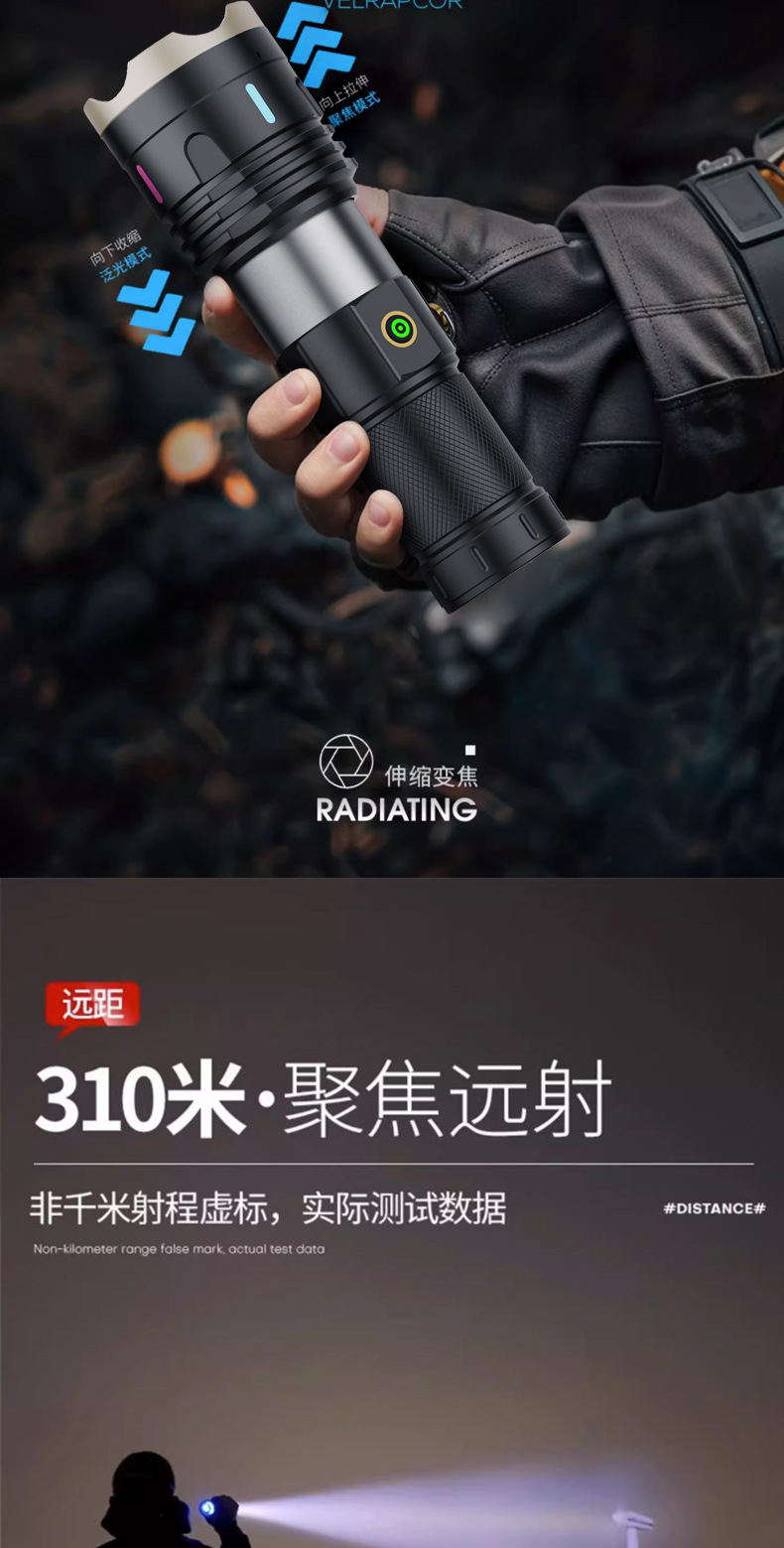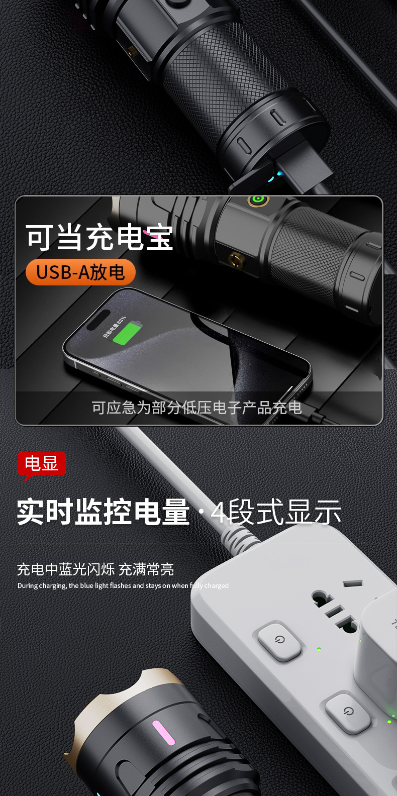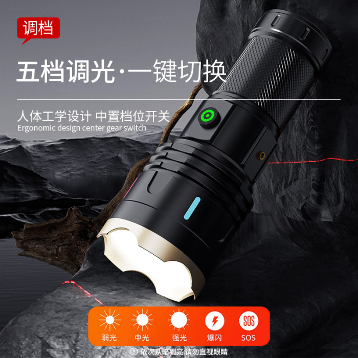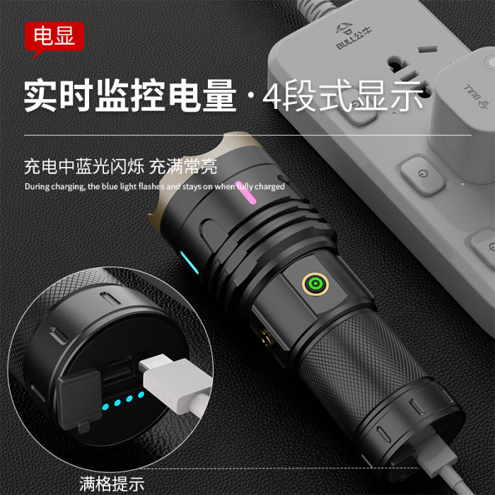 新款戶外強光遠射LED探照燈充電超長續航照明鋁合金手提電筒