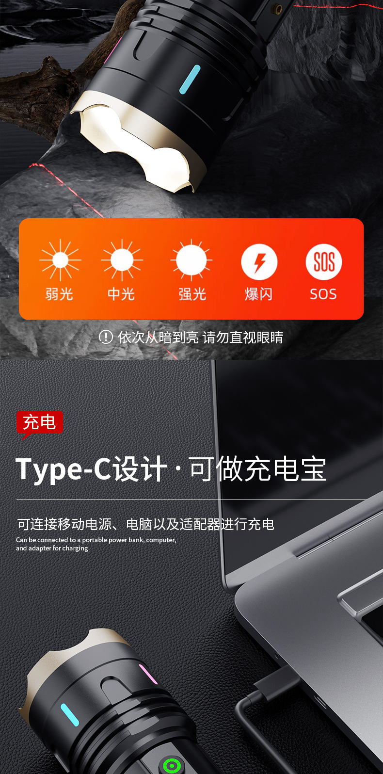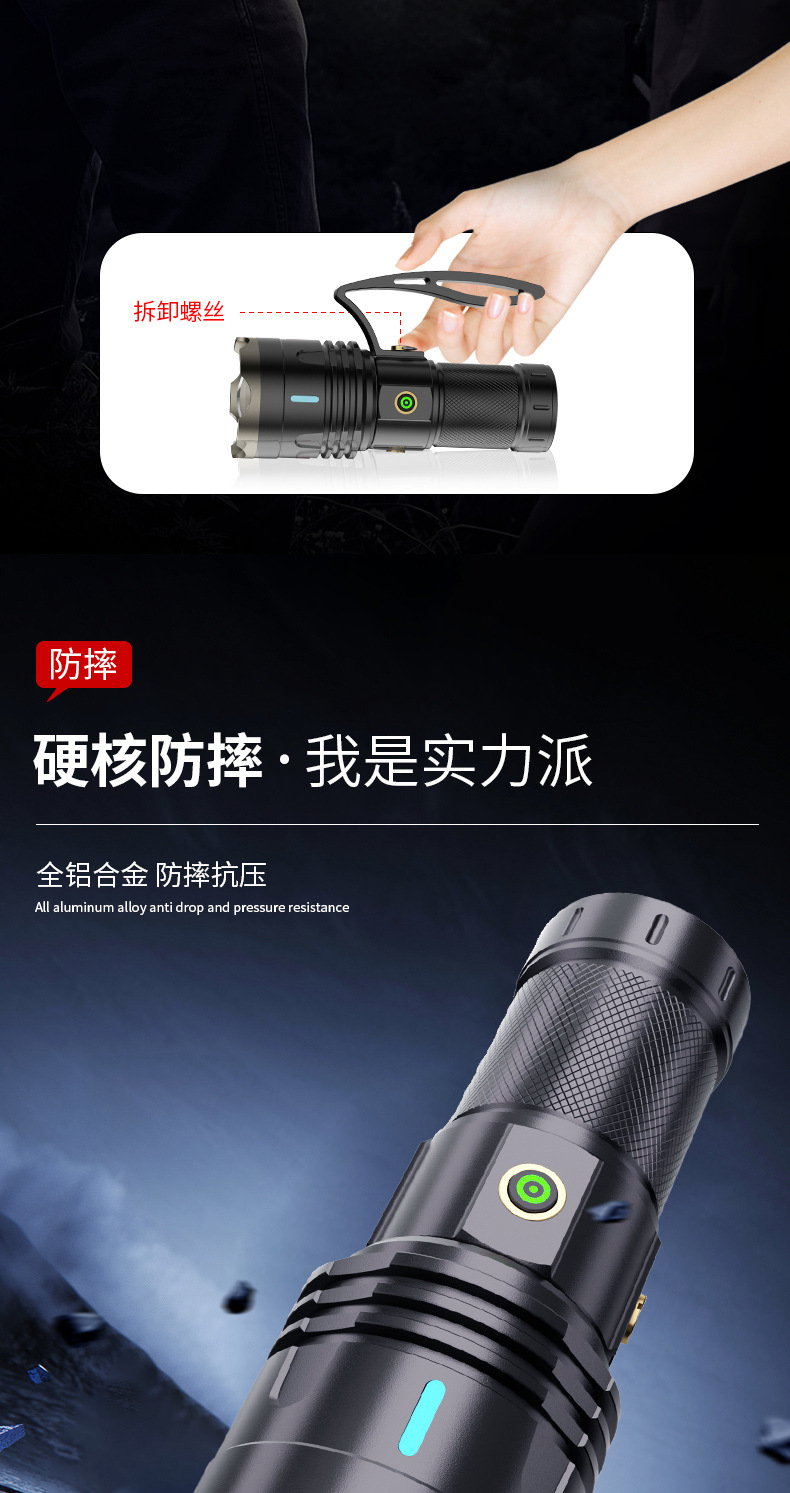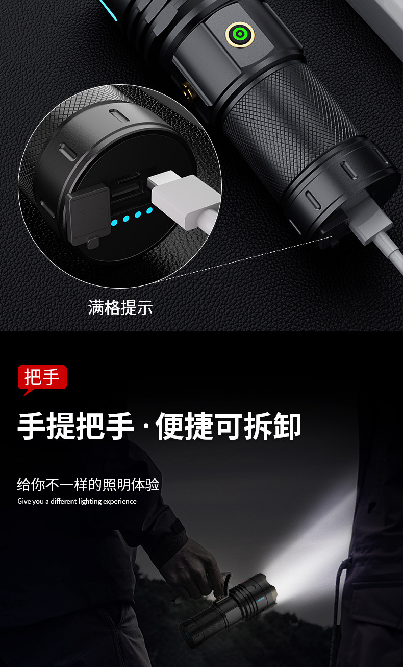 新款戶外強光遠射LED探照燈充電超長續航照明鋁合金手提電筒