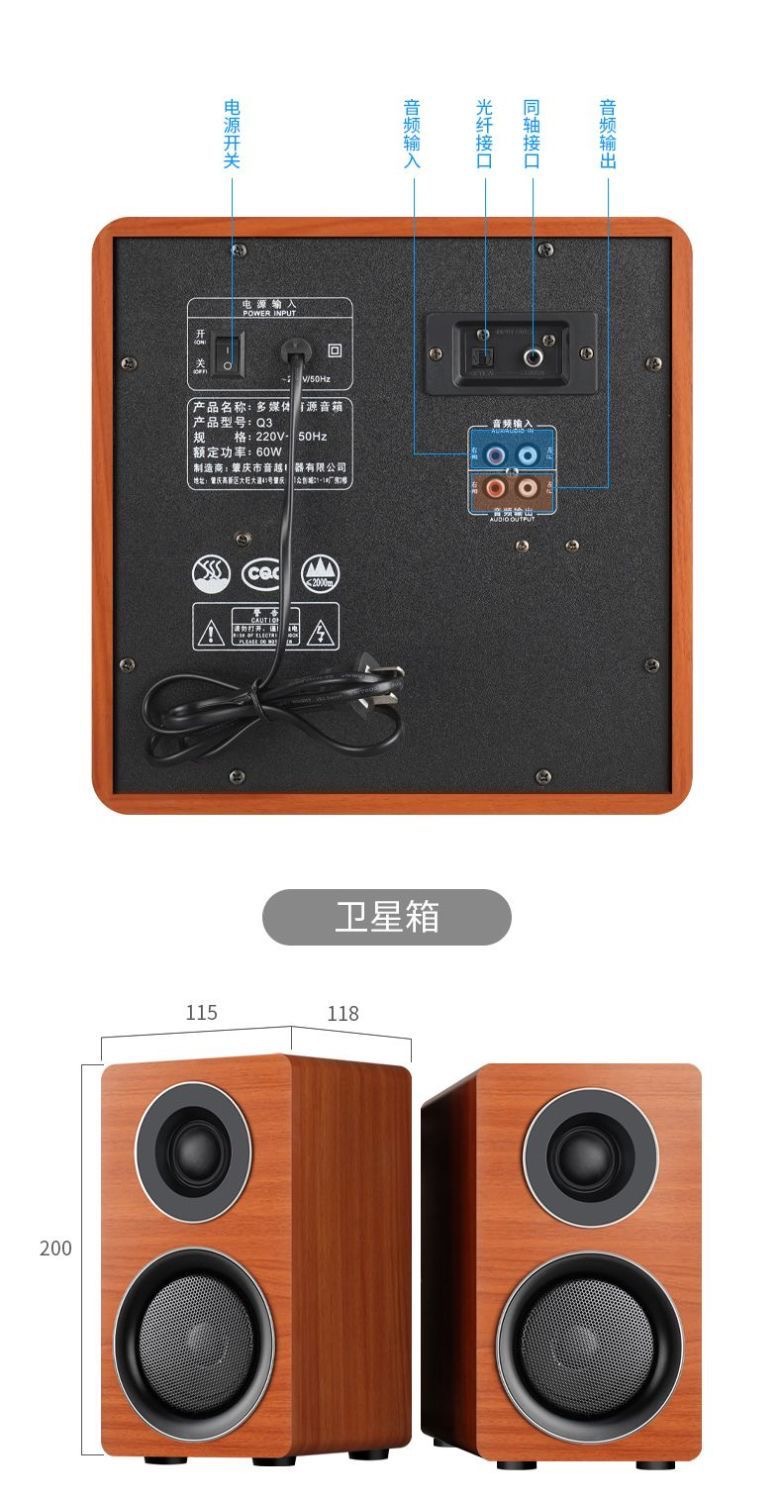 外形尺寸 | 主音箱尺寸260*260*260mm 衛星箱尺寸115*118*200mm |