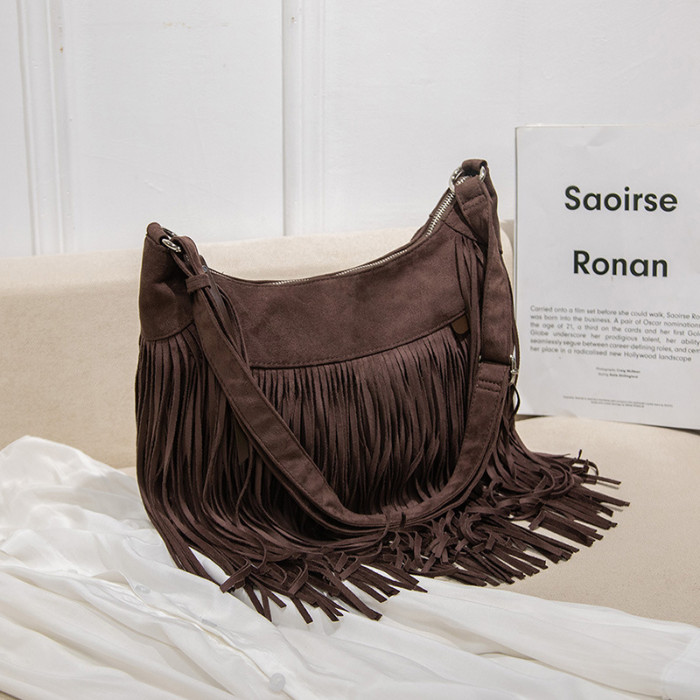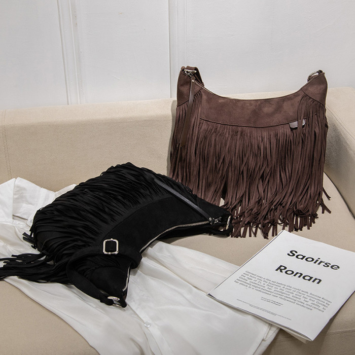 2024春季復古流蘇單肩包歐美個性潮流女包時尚百搭純色斜背餃子包