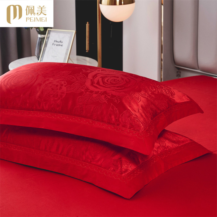 新款貢緞提花枕套一對裝全棉結婚喜慶大紅色純棉枕芯套婚嫁枕頭套