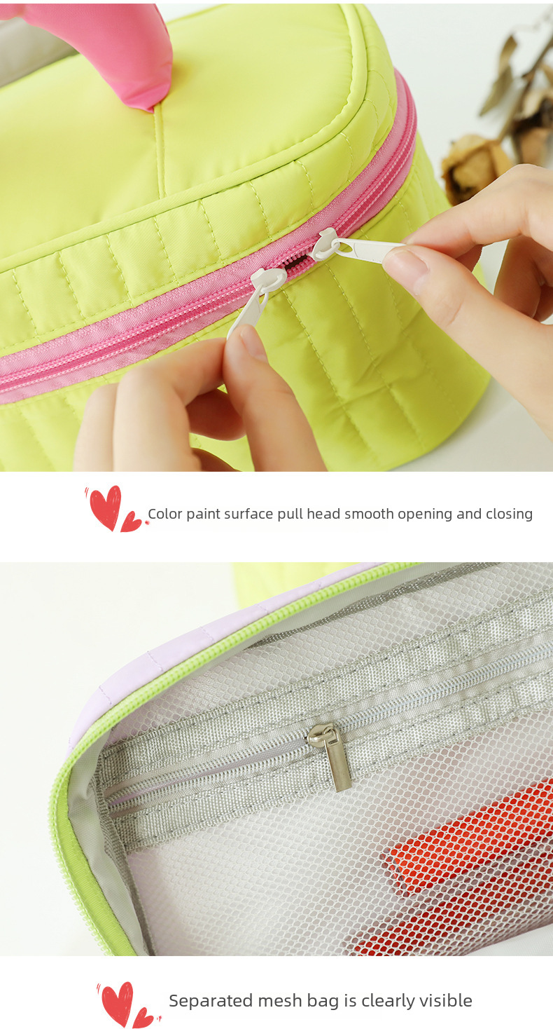 Color Block Design:Featuring a trendy color block design, this bag stands out with its vibrant contrast colors. It's not your typical storage bag, but a fashionable addition to your everyday essentials.