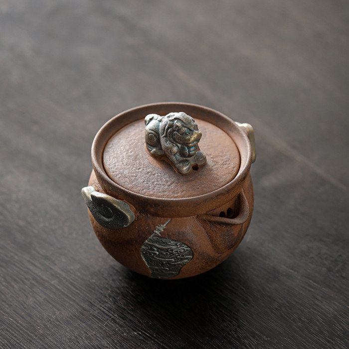 老巖泥鎏銀祥雲醒獅壺家用復古手抓壺泡茶專用純手工茶具