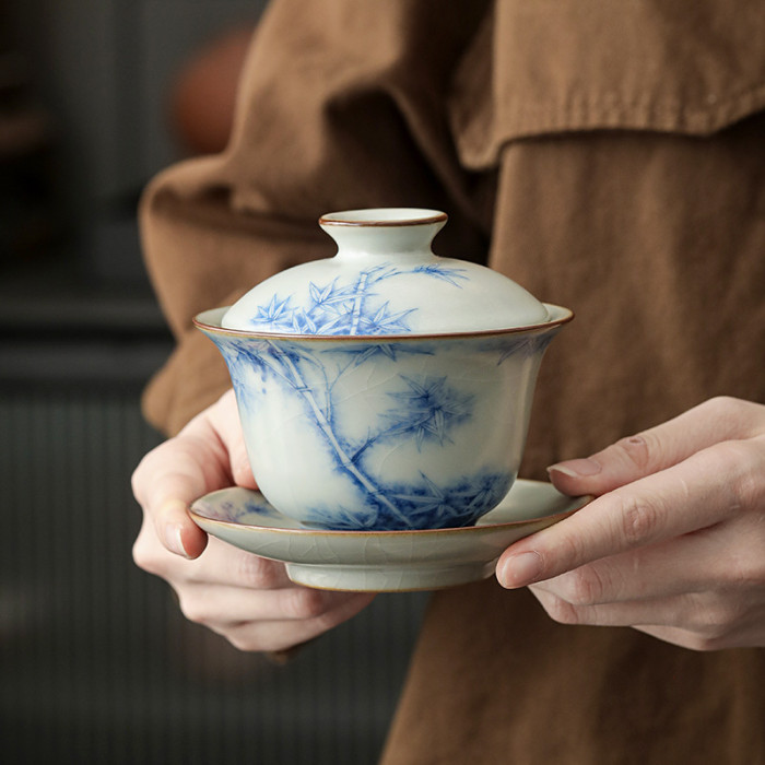青花汝窰蓋碗茶杯單個高檔泡茶壺手抓壺家用旅行茶具防燙茶碗帶蓋